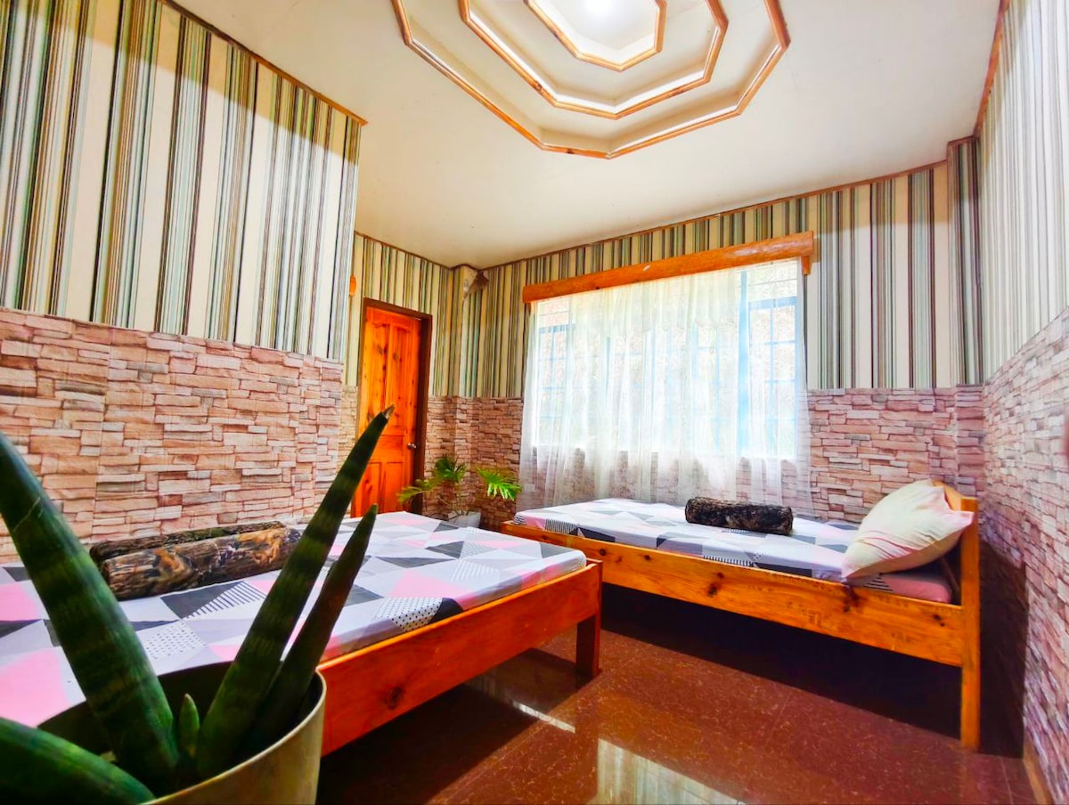 Amlangan Lodge room 2 is a private cozy room with 2 "double size" beds. It is located the same level with the building entrance/lobby/dining with no stairs to take. It has private toilet (with bidet) , sink, & bathroom (with hot shower) separate from each other, enabling guests to use these simultaneously and keeping the toilet floor clean, dry, and more comfortable. It has a balcony with a stunning view of pine forest & rock formations, which can also be viewed from your bed.