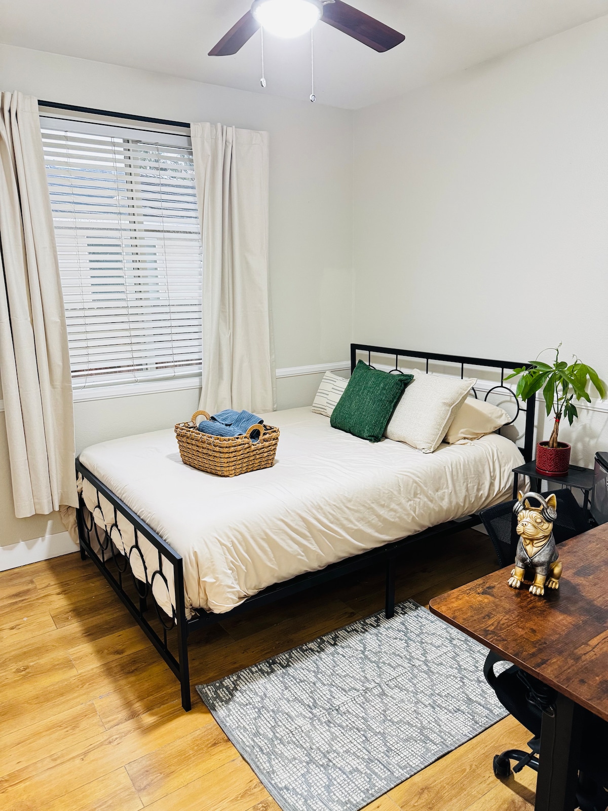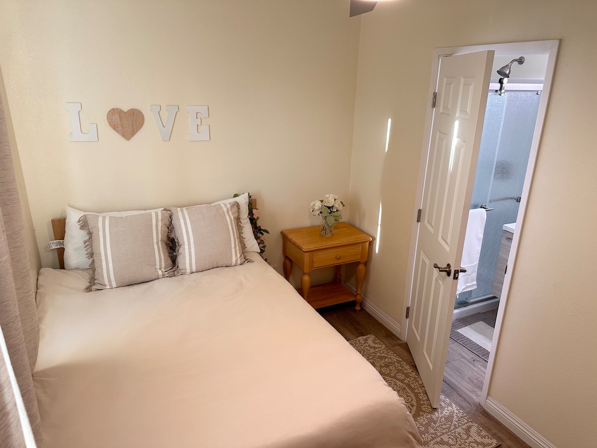 1BR/1BA Guest Suite ~ 350 sqft Private Entrance (Keyless Entry) Personal Thermostat Complimentary snacks, drinks, & toiletries Queen Tempur Pedic mattress w/ adj base 65 inch Smart HDTV in living room 55 inch Smart HDTV in bedroom Mini Fridge Electric Double Stove Top Keurig machine Board Games Desk