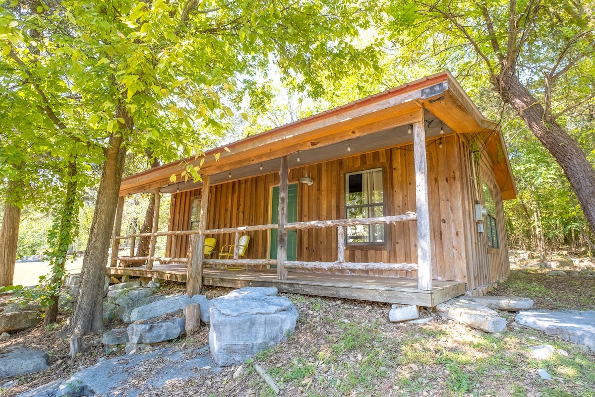 Relax in this native stone rustic cabin built of local rock and cedar logs. With a waterfall trickling into a spring tank pool right outside your back door & a cozy gas log fire beside your queen bed, you’ll never want to leave. Nestled in the Roasting Ear Creek valley on 200 private acres, this cabin is the perfect spot for a couple to relax and unplug. There’s a big screened porch for lounging with a HOT TUB, an outdoor kitchen, dining area, ceiling fans, & beautiful views. **Now with WiFi!**