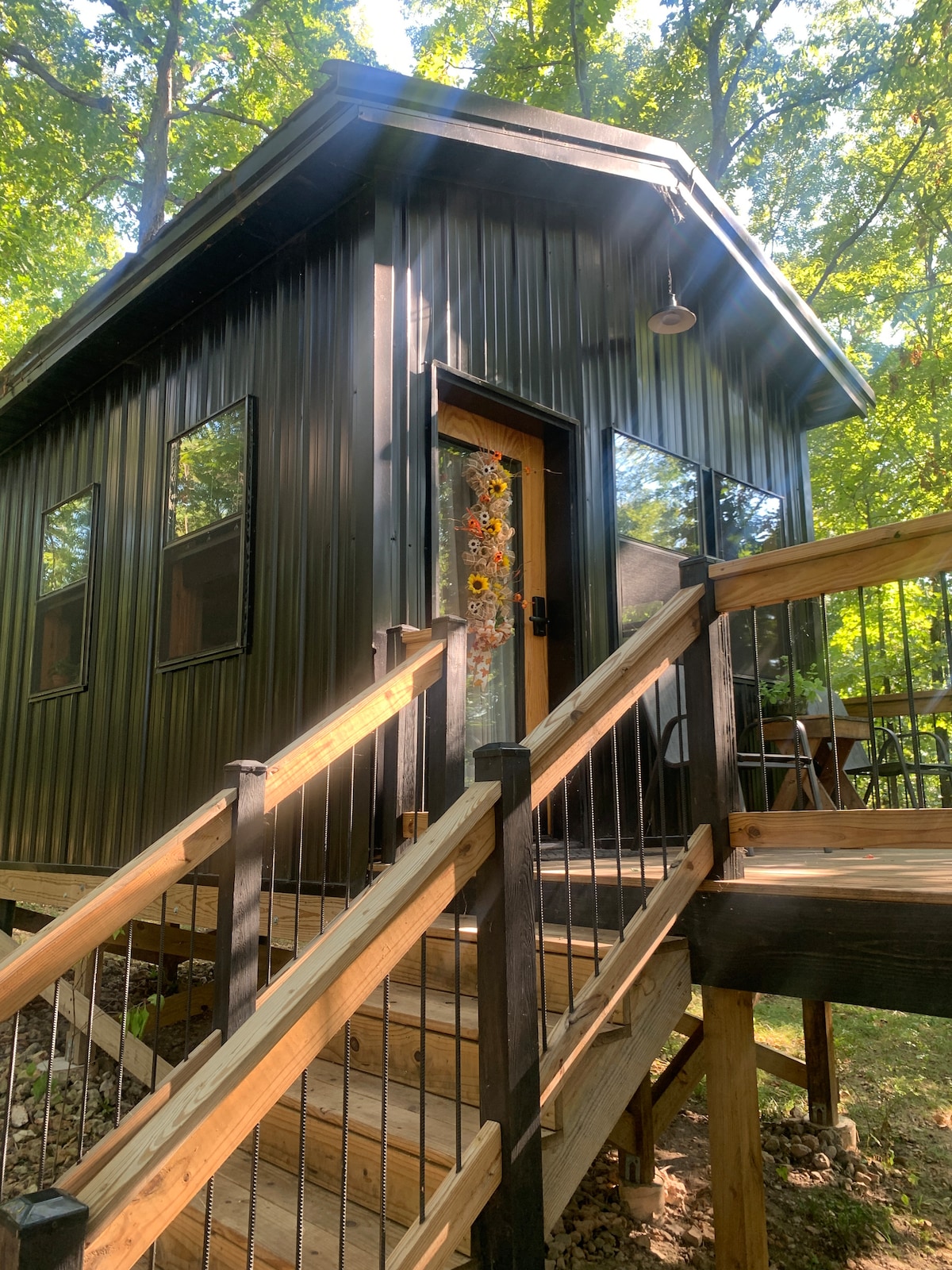 This unique place has a style all its own. Modern, light industrial interior, located on a bluff overlooking the Sylamore Creek, just 500 yards from the White River in Mountain View, AR. You have your own private fire pit, picnic area and charcoal grill. The scenery is awesome and the location is right in the middle of everything. Minutes from the famous folk music square in downtown and just a few miles to Blanchard Springs. You are literally at the edge of the National Forest. You'll LOVE it!