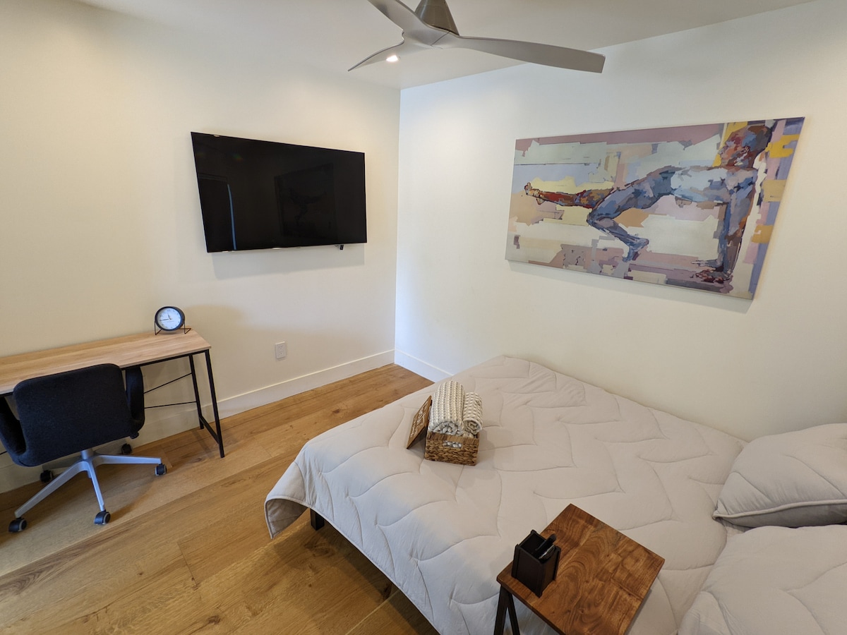 Experience downtown Mountain View 4 blocks from Castro Street where street life abounds. This large, private guest suite—sharing a wall with our home, but completely private with its own entrance— sleeps up to 6 and sits in beautiful residential Old Mountain View. Enjoy the simple pleasures of a thoughtfully appointed suite with amenities such as tv, kitchenette, outdoor sitting, desk, walk-in shower. Note *The kitchenette does not have a sink and is intended for light meal preparation.