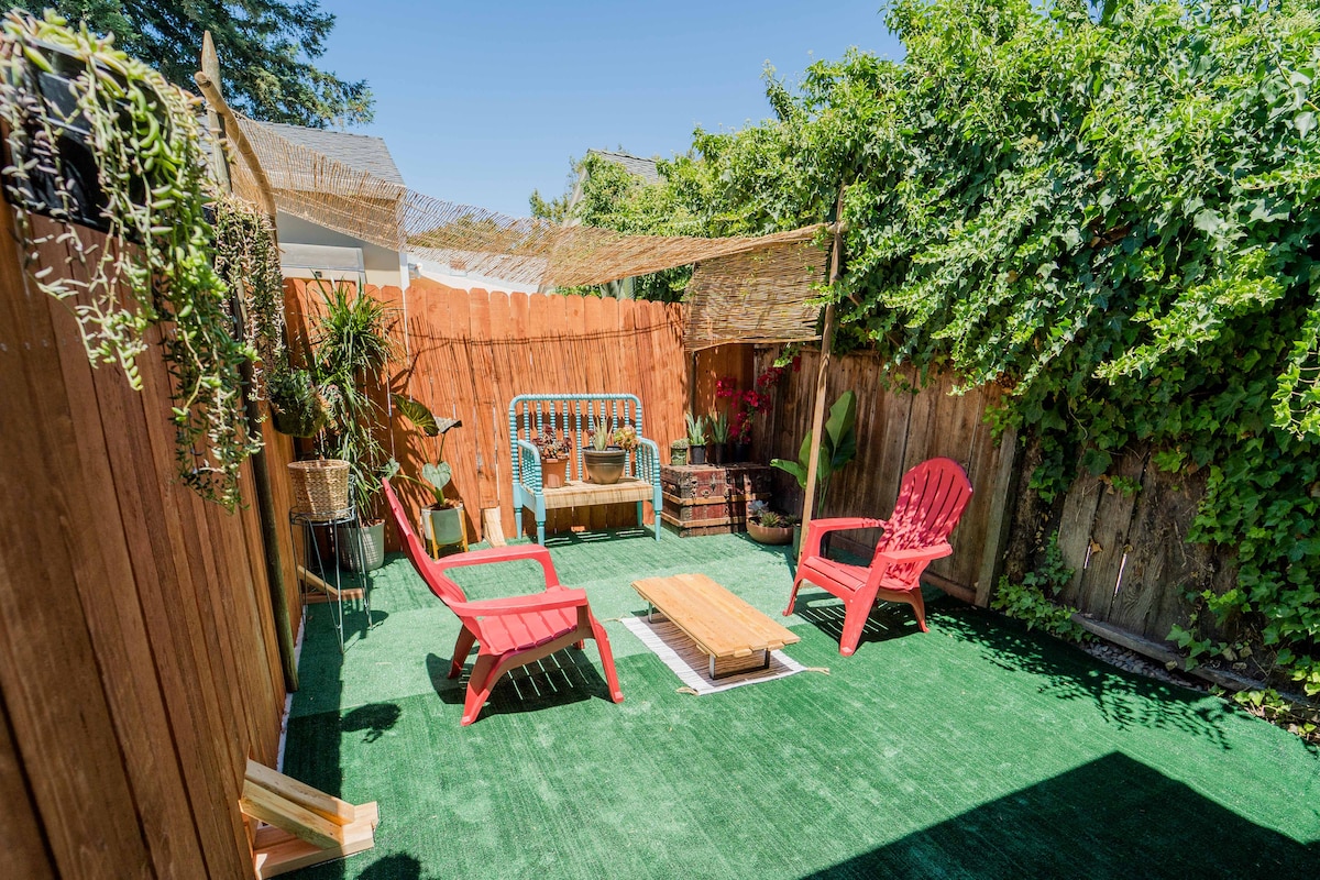 ~Close to many tech companies ~Yard with kids play structure/Gazebo ~Pack'n Play for baby ~Free parking and EV Charging ~Hi-speed WiFi ~New kitchen and appliances ~Sofa bed for 1 extra person ~Central AC and Heater with Nest ~Smart 55''TV with Netflix. ~Walking distance to downtown/shops/parks ~Quick access to 101 fwy and Central Expy ~Kitchen equipped with utensil essentials ~Best value Airbnb The big lot is separated into 2 units. This Unit B is a 2B/1B ADU with full privacy, the RED area