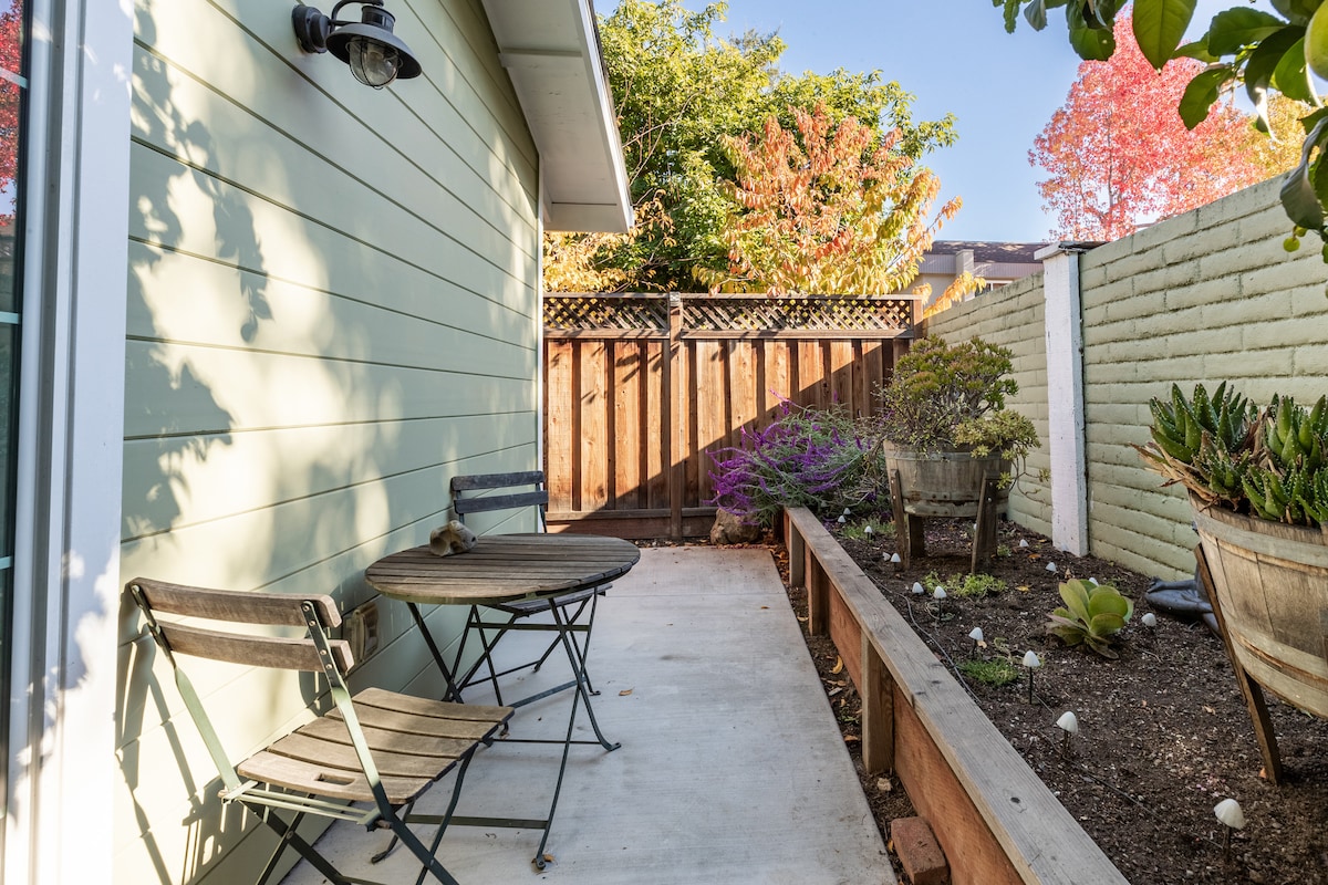 Recently painted, our quiet, safe, very clean and quaint Mediterranean style guesthouse, is located in a landscaped yard underneath a Redwood tree, and is suitable for only 1 guest. You can conveniently walk to Midtown neighborhood cafés, great eateries and markets. Quickly access the Stanford campus, Silicon Valley companies, San Antonio Shopping areas, and California Ave Caltrain Station by car. You're welcome to enjoy our backyard, nap in the hammock or work on the patio with WiFi access.