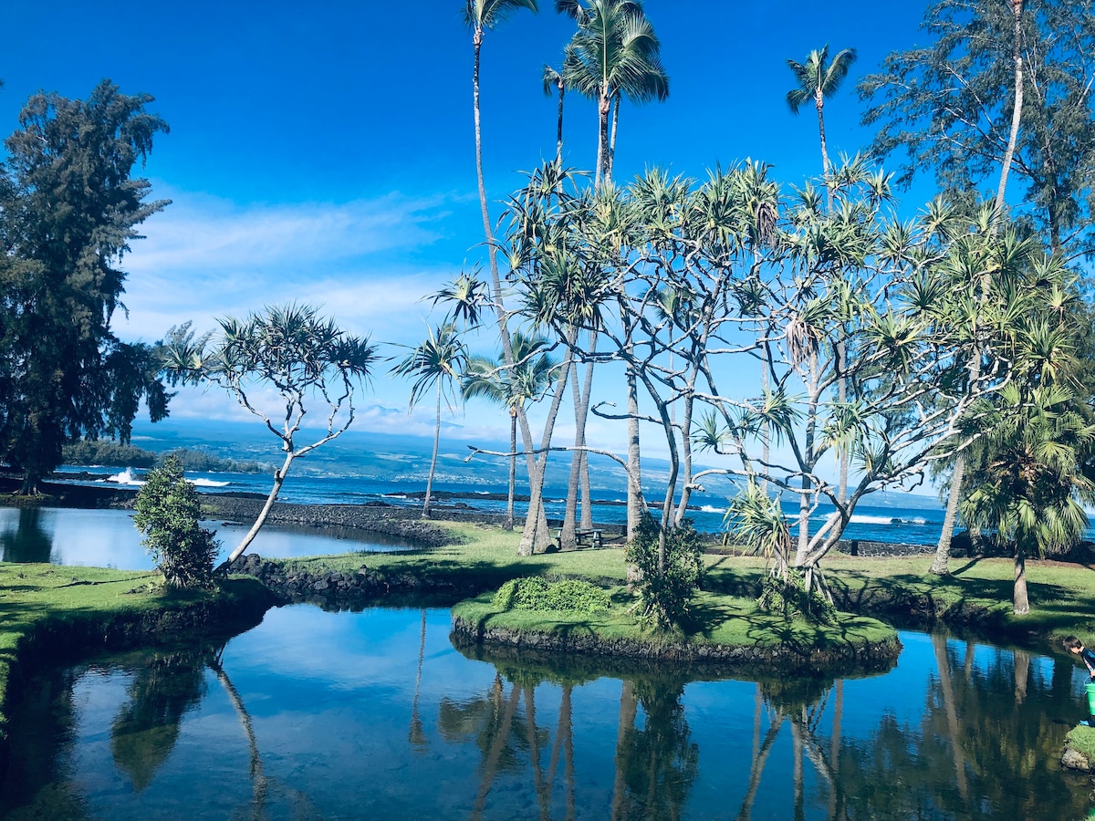 This remodeled air-conditioned condo is perhaps one of the best located accommodations in Hilo. Near the center of town, yet the grounds feel like a tropical zen oasis! Koi filled streams and ponds lined with walking trails meander through the complex. Minutes from the airport, farmers markets, golfing, shops, and over 100 restaurants! The complex also backs to Wailoa State Park where you can walk through over 130 acres of beautiful grounds and unique bridges leading to the beach at Hilo Bay!