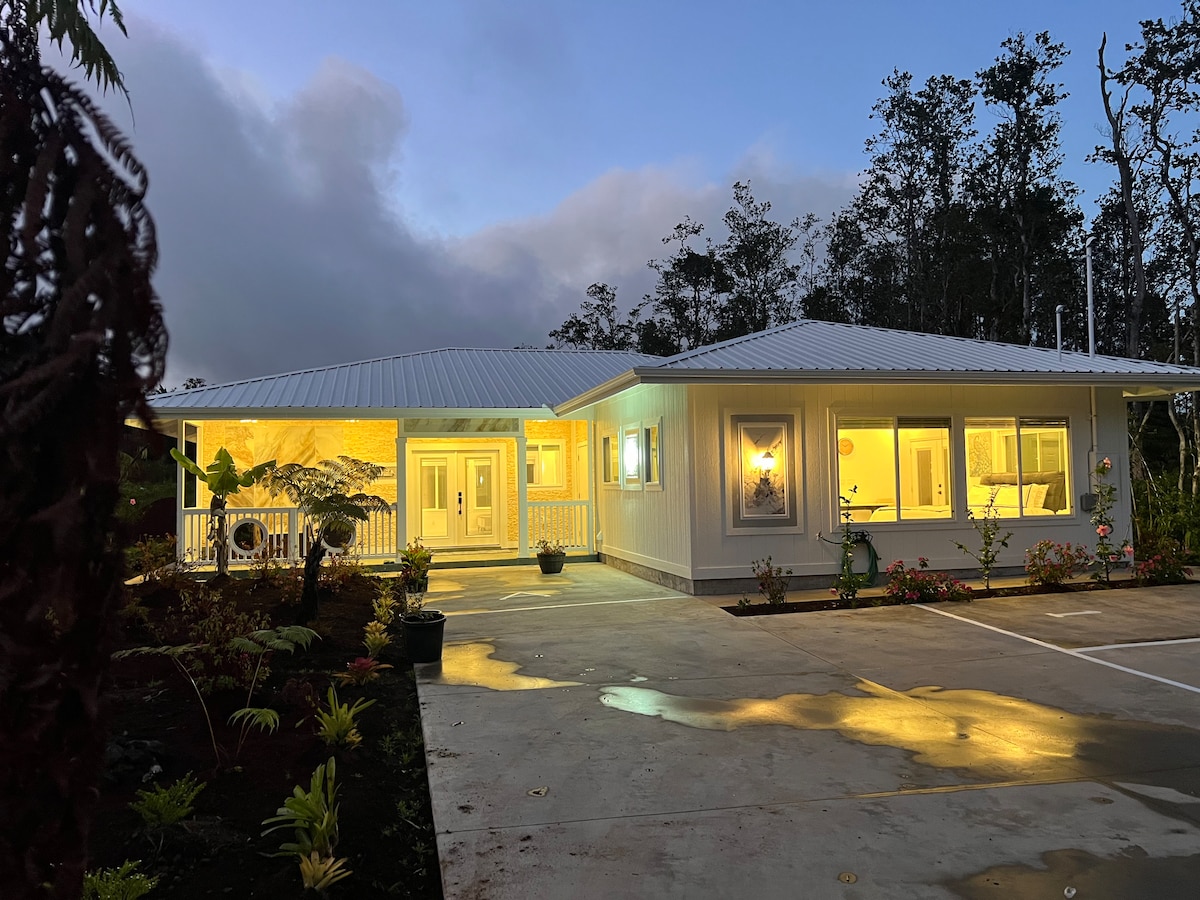 The Pua Hale BRAND NEW, stunning, spacious upstairs condo unit with tons of class. Open full kitchen with all the amenities, full private custom bathroom, extremely plush memory foam king size bed. Get comfortable on the lanai space or have some fun on the grass volleyball/badminton court! Take an evening dip in the hot tub under the mango trees and enjoy the outdoors. Enjoy the nearby Volcanos National Park, tide-pools, beach hike, ocean and waterfalls!