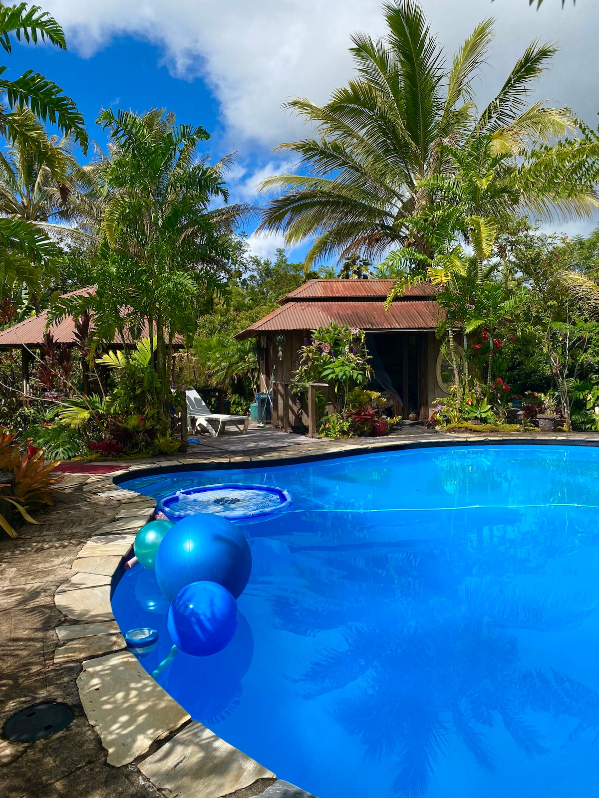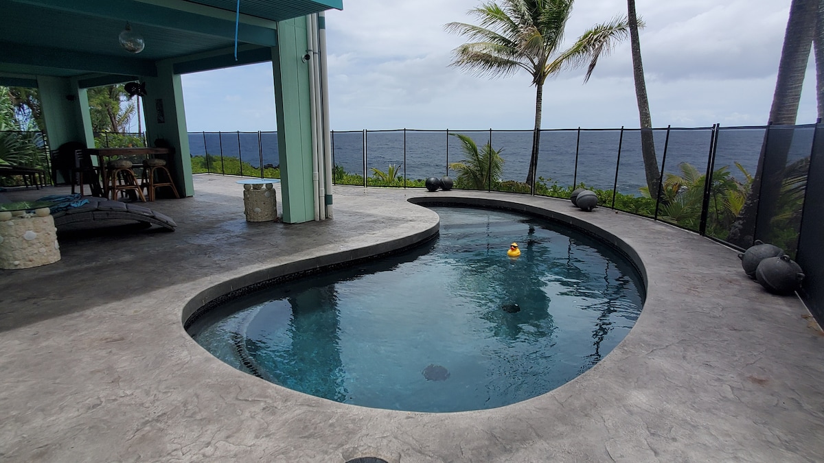 Feel the tropical vibe as sunlight pours into a fun and unique 12-sided home with a central dome skylight and vaulted ceilings. Casual, stylish furnishings, playful textiles, beautiful Balinese hardwood floors, a well-appointed kitchen and a deep, jetted tub with an oversized rain-showerhead create an inviting interior. Outside is the irresistible allure of your own private pool surrounded by lush greenery made complete with a soothing outdoor shower. Enjoy exotic flowers, fruit trees, native plants, and a beautiful lava-rock wall landscaped to give you complete privacy. Close to Kehena Beach!