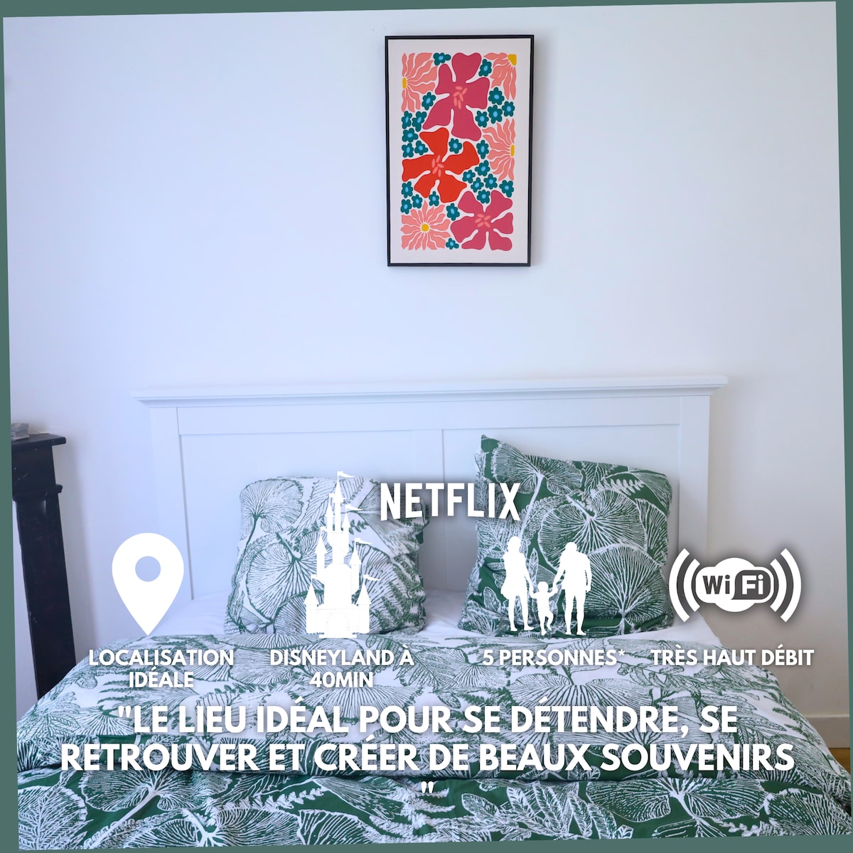 Découvrez cette belle chambre paisible, chaleureuse et décorée avec goût. Idéalement située. Lit double - entrée/douche italienne et WC privatifs. A proximité : - Parc des Capucins 800 m - Parrot World 13 km - Parc des Félins/ Terre des singes 16 km - Disneyland Paris 28 km - Val d Europe / Vallée village 28km - Cite médiévale de Provins 38 km - Paris 59 km
