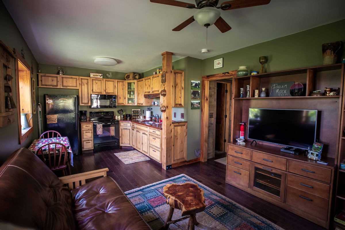 We have been renovating an old 1950's dairy barn since 2013. We fell in love with this location because the barn is set in a beautiful valley in the Appalachian Mountains. You have to drive through the creek to get to the barn. We built this private bungalow on the creekside of the barn with its private entrance. It is close enough to the creek to hear it from your bedroom window. *** We also have 2 other Suites available: Dream Rock Silo, sleeps 2 Rustic Rooster Room, sleeps 6