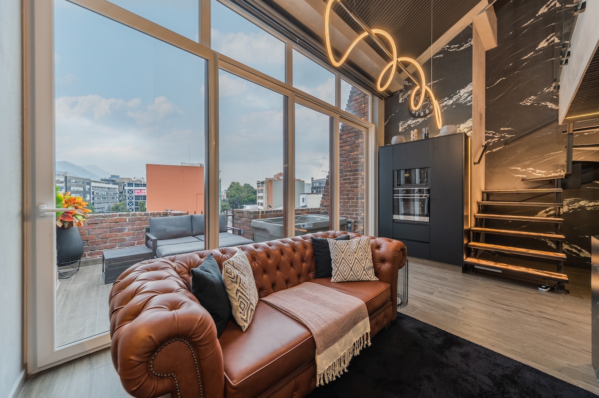 现代阁楼。露台,私人按摩浴缸。