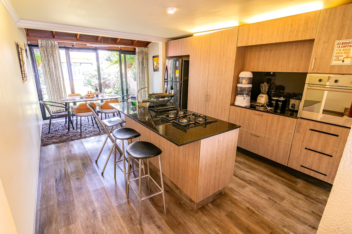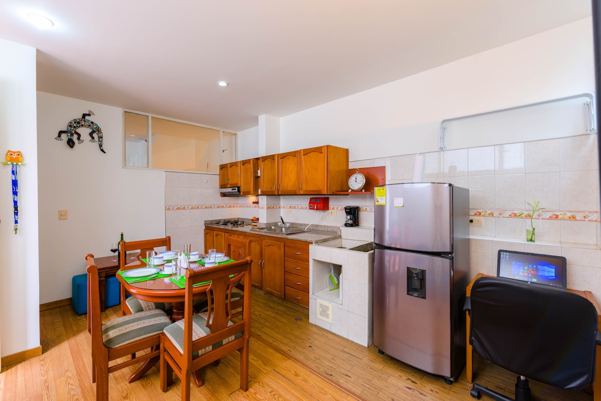 Our comfortable one bedroom apart-studio, interior location with windows towards a garage, and to a courtyard, bohemian, minimalist, with a small garden has a true city feeling! It comfortably accommodates four people and it´s centrally located on a street, with easy access to Simon Bolivar Metropolitan Park. Enjoy a complete kitchen, and access to Transmilenio. This space is ideal for two people; however, we provide a high quality sofa bed for two more people should the need arise. Hot water