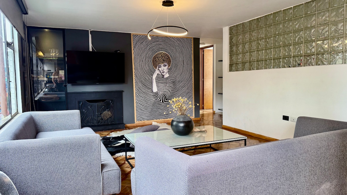 Live Bogota in this Luxury, new hotel-style ! This 2 Bedroom+ 2 Bathrooms+1 sofaBed+ private Jacuzzi Spa with 65” tv in the spa + epson laser projector CINEMA! centrally located in the prime area Chico , short walk from restaurants and shops. Located within 1 mile to park 93, this 5*Hotel-Style Suite brings you to live Bogota the right way, work or play,  decoration a unique design luxury apartment, great vibe with a 190sqft private terrace! Just for you! Fiber Wi-Fi and 1 parking are included.