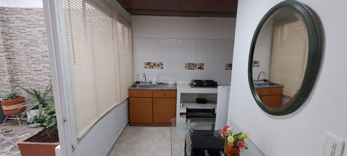 Estudio independiente dentro de casa – ideal para parejas o viajeros solos. - Zona amplia de estudio, cuenta con una recamara con cama doble en techo bajo a 1,75 cm alto y más bajo 1,30 cm, cocina y zona de lavado con secadora. - Servicio de parqueadero compartido, la entrada a la propiedad es por garaje, siendo zona de entrada para ambos lugares