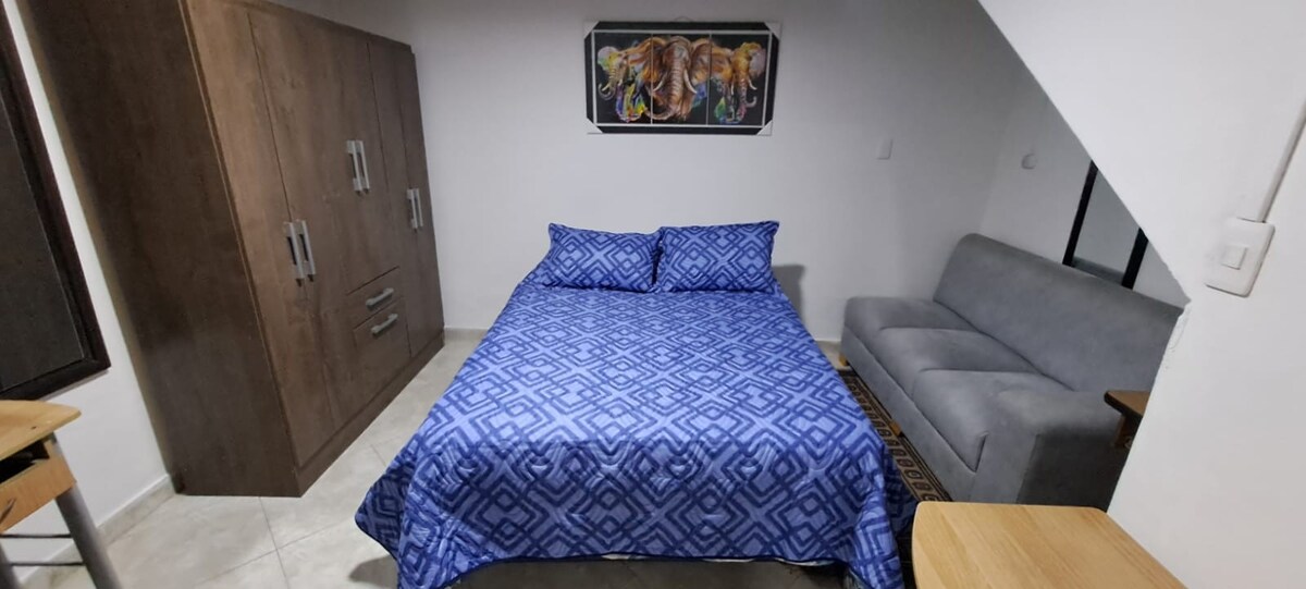 Este acogedor apartaestudio es de uso exclusivo, independiente y privado consta de una habitación amplia, con una cama doble, TV, clóset y mesa de escritorio, baño con agua caliente y una cocineta con nevera la cual tiene lo necesario para cocinar como ollas, loza, cubiertos y otros adicionales. El apartaestudio se encuentra ubicado en la parte de atras de la casa principal, por lo que la entrada es compartida entre ambos. El apartaestudio tiene una buena iluminación, es muy limpio y acogedor