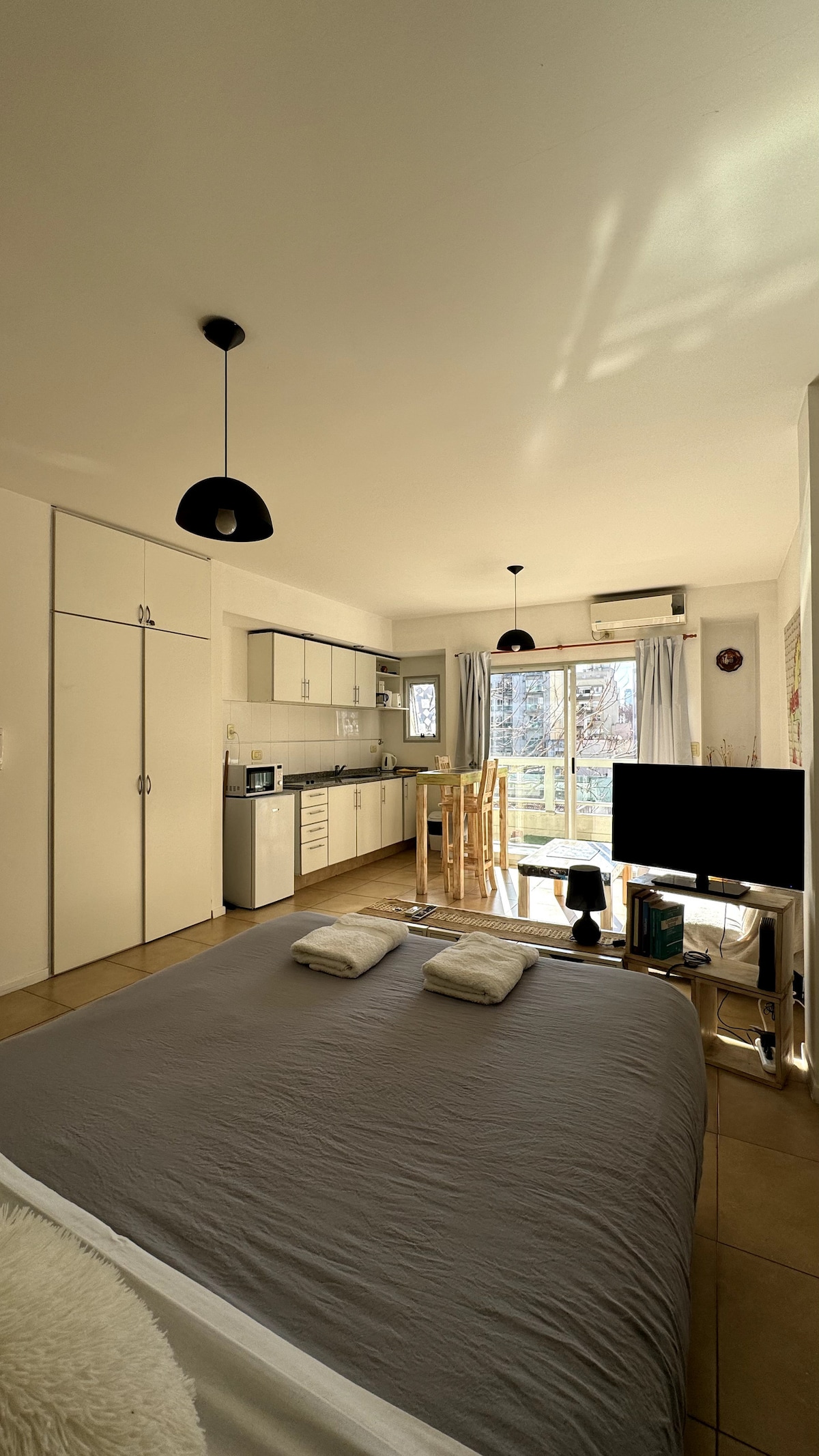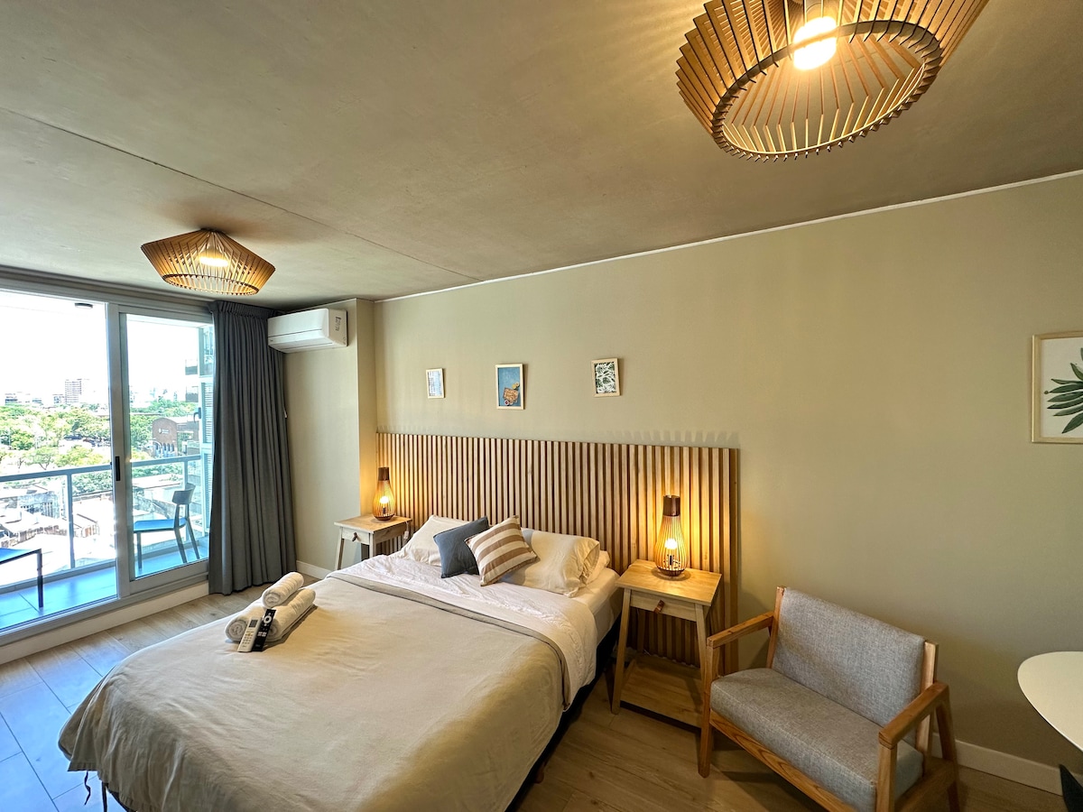 Acogedor monoambiente en Palermo, ubicado en 3er piso al frente con balcón, vista arbolada. Completamente equipado con todo lo que necesitas para una estadía cómoda. Cama Queen size, cocina totalmente equipada para dos personas, Tv con plataformas de series y películas activadas, WIFI, sábanas y toallones. Ubicado en una de las zonas mas cómodas y buscadas de la Ciudad, teniendo en sus alrededores gran variedad de restaurantes, locales comerciales, estadio Movistar Arena y transportes.