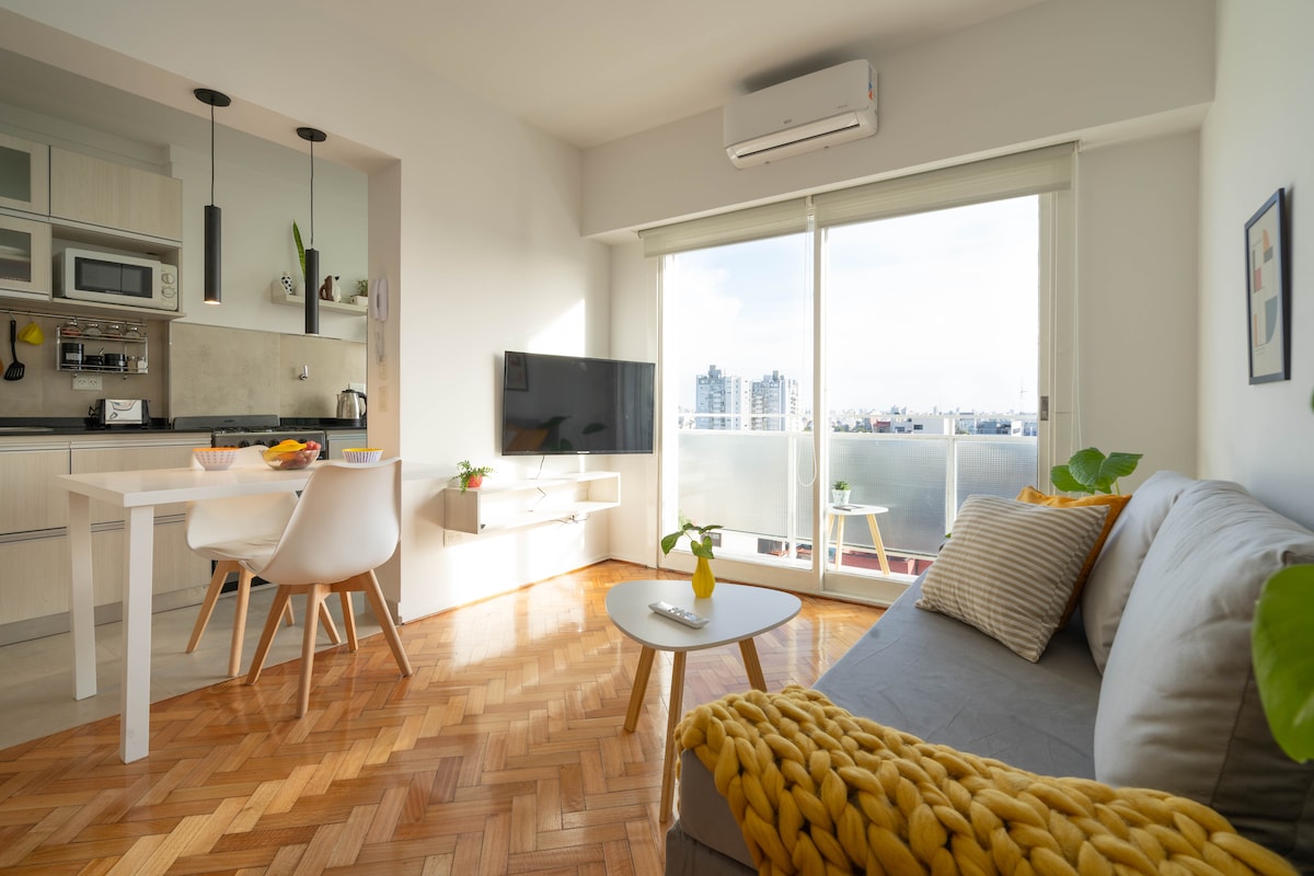 Hermoso monoambiente, en un séptimo piso, cómodo, totalmente equipado, con vista a la plaza Benito Nazar. Barrio tranquilo y seguro, con amplia oferta gastronómica y cafés. Cuenta con todos los servicios necesarios para pasar la mejor estadía. Calefacción central, aire acondicionado, TV 50 pulgadas, internet, flow, Mubi y Netflix. Muy cerca del parque Centenario, de la Av. Corrientes, de Palermo, del Movistar Arena, del hospital Duran. Transporte público para todos los puntos de la ciudad.