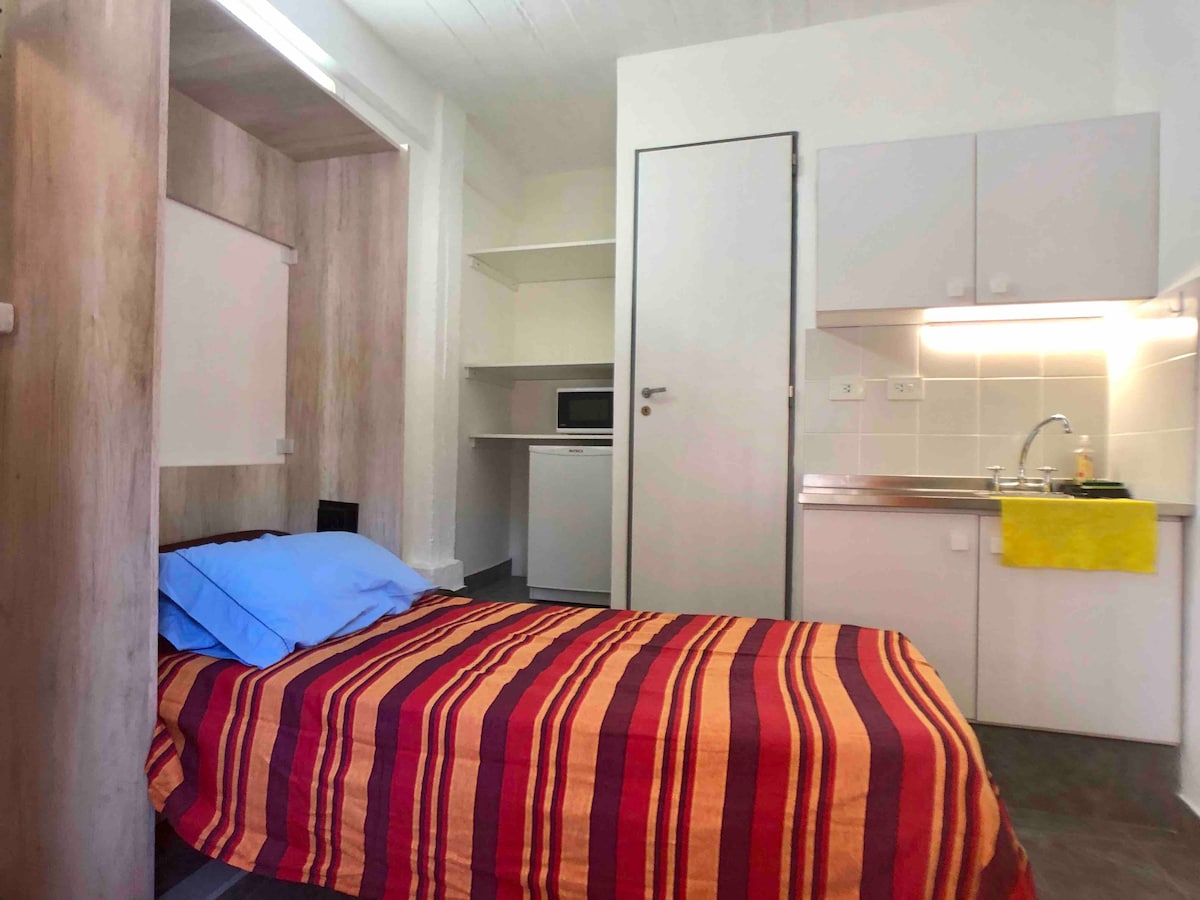 MICRO Departamento MUY PEQUEÑO de 8,5 m2 ideal para 1 PERSONA JÓVEN con poco equipaje que desee privacidad. A solo 4 cuadras del Estadio "Movistar Arena" y a 10 minutos caminando de 'Palermo Soho'. Por su cercanía a estación Malabia del subte (metro) línea B y cantidad de buses, es ideal para estadías cortas, MAXIMO 4 NOCHES. Tiene TV led de 24”, aire acondicionado, videocable, calefactor y red Wifi. IMPORTANTE: NO APTO PARA COCINAR, tiene pava eléctrica y microondas. NO TIENE COCINA.