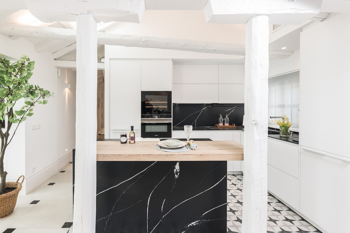 Open tall wooden shutters and let morning light stream into a room with exposed timber framing and whitewashed brick walls reaching to high ceilings. Have breakfast in a cheerful open space at a sunny table in front of an elegant fireplace. I have several apartments in Madrid, but this is the latest one I have decorated, paying close attention to detail. I have truly tried to make it as comfortable as possible for my guests. It has lots of light and it's beautiful. If one were to read my reviews they would notice that I care a lot for my guests, I am always readily available, and I try my best to make them feel at home when they are in Madrid. You will have the whole apartment. We will be there in person to meet you, and give you the keys. After you book, I give you my number and you can text or call if needed. The apartment is in Chueca, one of the nicest and trendiest neighborhoods in Madrid. Walk to the main street, Gran Via. It's near the Prado, Puerta del Sol and Parque del Retiro. It's surrounded by wonderful places to have tapas and a glass of wine. We are about a block away from the Gran Via, you can walk everywhere, but we also have metro stations and buss stops nearby. If you are coming with a car, there is a Public Parking Garage about 2 minutes walking from the apartment.