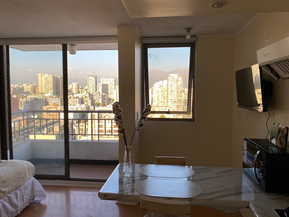 Bienvenido a conocer Santiago, te esperamos en nuestro cómodo departamento estudio. Ubicado en pleno barrio universitario, a pasos del metro y de la principal vía de la ciudad. A pasos del MOVISTAR ARENA, del CLUB HIPICO y PARQUE O´HIGGINS, donde se realizan los principales conciertos de artistas extranjeros y nacionales, se puede ir a pie. La linea de metro lo puede llevar a los diferentes puntos de atracción de Santiago. Ideal para parejas o viajes de negocios.
