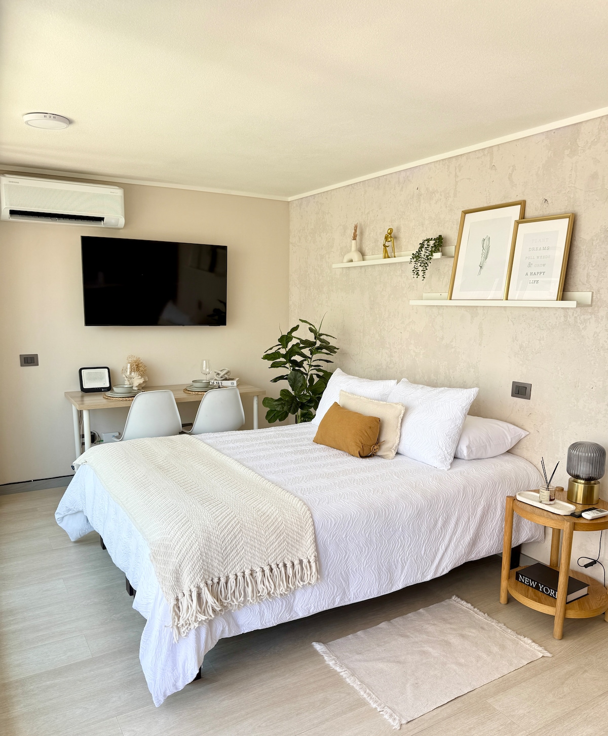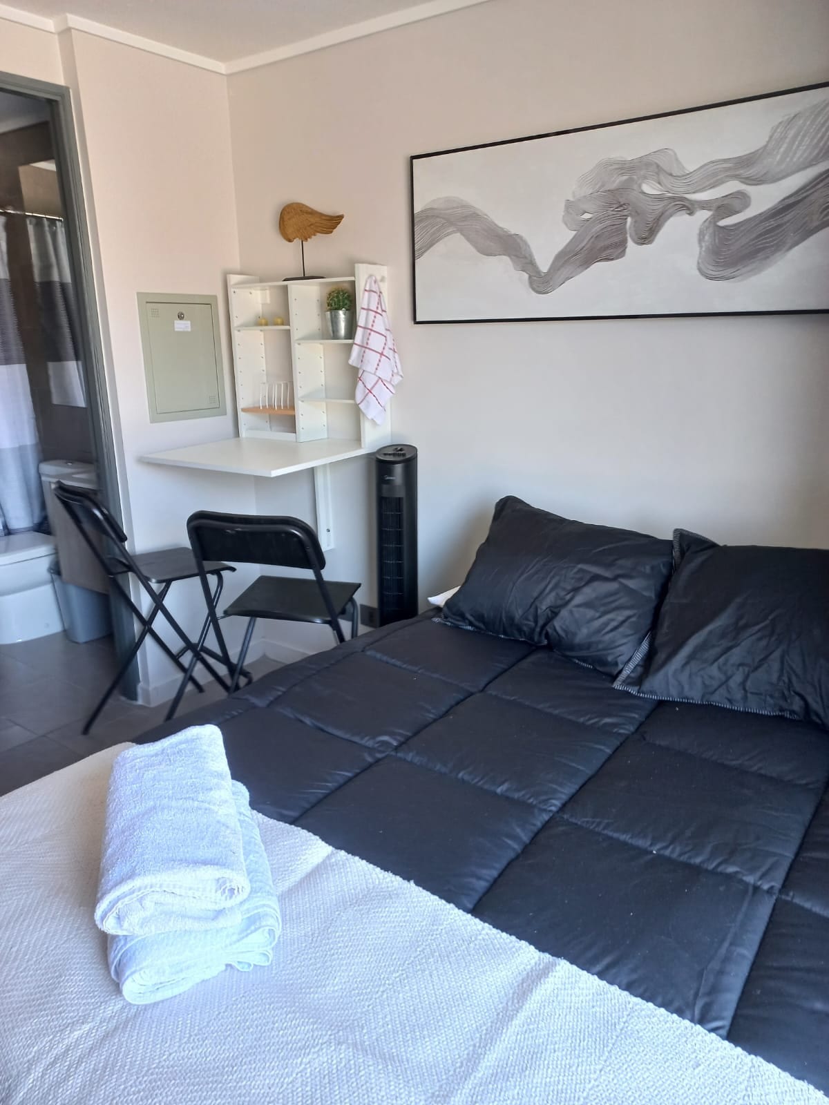 Estudio cómodo y funcional, ubicado a pasos del metro Rondizzoni, del Parque O’Higgins y del Movistar Arena, ideal para conciertos, eventos y disfrutar el verano en Santiago. Cuenta con cama de dos plazas, TV, wifi y ventilador, perfecto para descansar luego de un show o paseo. Incluye ropa de cama, toallas y electrodomésticos. Entorno tranquilo, con opción de check-in tardío.