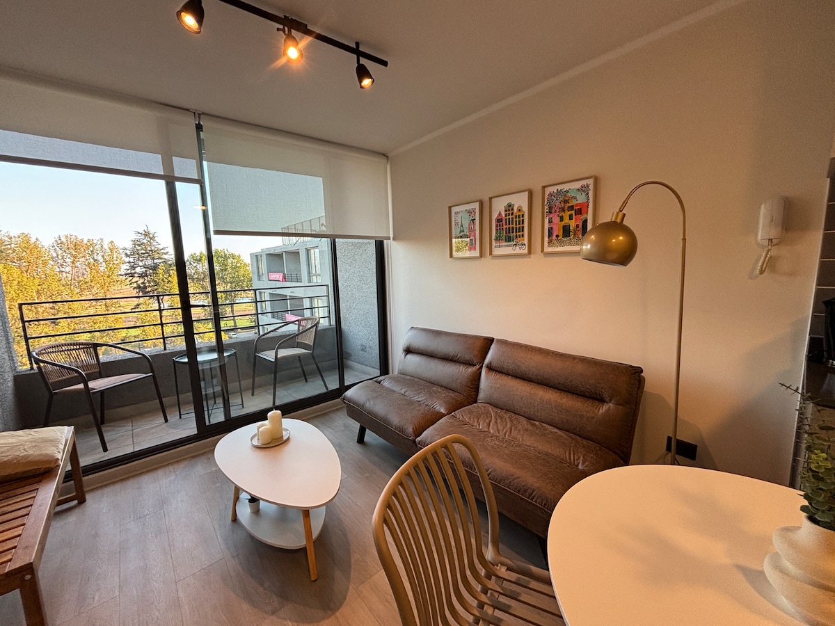 Departamento moderno y acogedor, ideal para estadías cortas. Excelente ubicación, cercano a Movistar Arena, Club Hípico y Fantasilandia, con buena conectividad al resto de la ciudad. Cuenta con una excelente cama king, Smart TV, internet, y una cómoda terraza para descansar. El edificio dispone de piscina, quincho, sala de trabajo, gimnasio, entre otras comodidades para uso de los huéspedes. Una muy buena opción para viajes por eventos, trabajo o escapadas de fin de semana.
