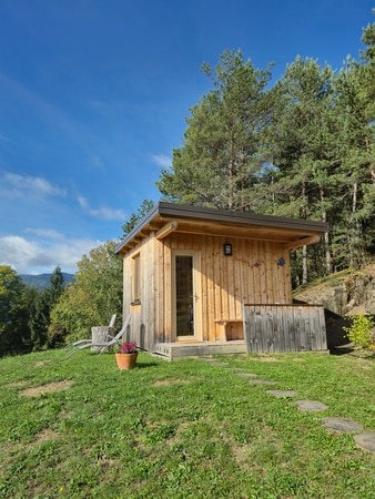 Wake up in a hut built with wood from our forest, in an idyllic location. In the morning, from your warm bed, you can gaze through the panoramic glass, and admire the magnificent view of the Kamnik-Savinja Alps. In the hut is one double bed with a pull-out extra bed, small kitchen with fridge, outdoor terrace with deck chair. Every hut has its own bathroom in the immediate vicinity (15m-30m).