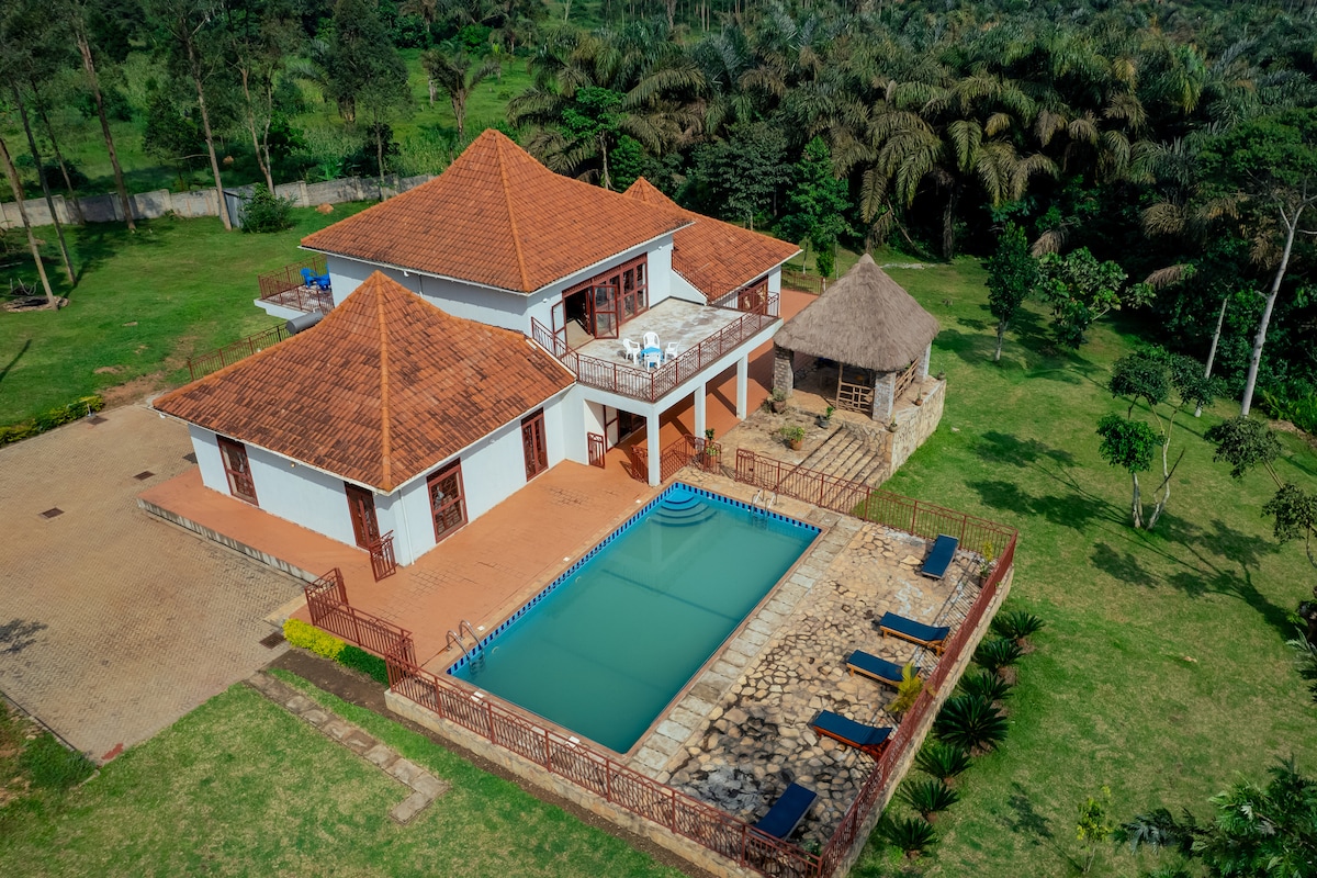 Beautiful architect-designed Home/Lodge in the countryside in peaceful surroundings with private forest. Only 1 hour drive from the airport and Kampala. You can frolic in a 300 sq m house, 450 sq m terrace, 60 sq m swimming pool for up to 11 people in 6 rooms. With kitchen staff and the permanent staff.