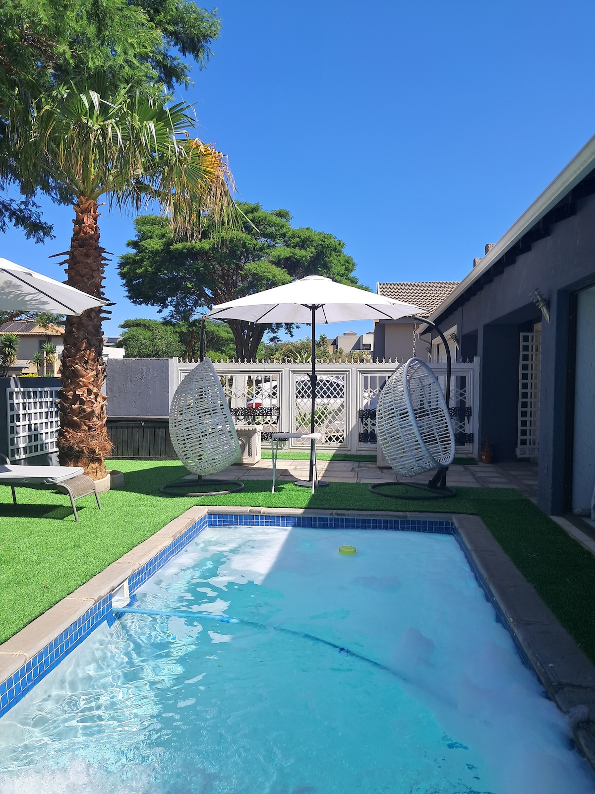 This place will transport you to a world full of flair, spoils and relaxation. The Luxury getaway you always dreamt of in another country right at your doorstep. Romantic getaway with all the Lux items like Egyptian Cotton bedding & towels, Custom made furnishings. A beautiful green oasis awaits you outside...Pergola with relaxing chairs to put your feet up, A jacuzzi to relax in, your own bar area, a hammock to read that book/soak up the sun. Outside cinema/Picnic/Romantic dinner can be set-up.