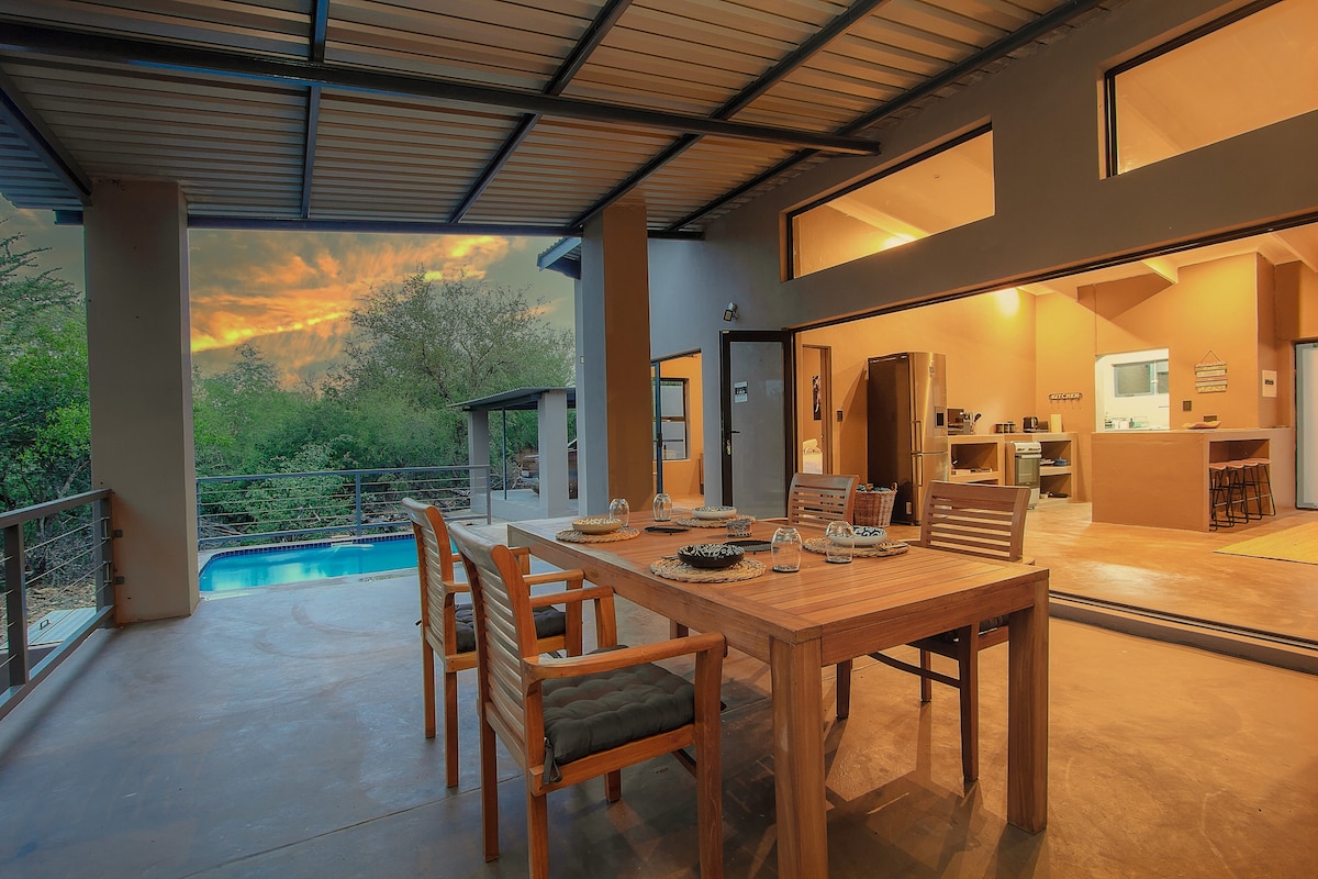 Birdsong is a private, self-catered, and solar-powered house in a wildlife conservancy adjoining Kruger National Park. Relax on the downstairs outdoor lounge with heated pool as zebra, kudu, and many others stop by to visit. Watch the sun set from the hammock on the upper patio. Exercise in the gym space. And if you just can't get away from work, there is a large table upstairs with a beautiful video background! Birdsong is just 15 minutes from Kruger's Crocodile Bridge gate.