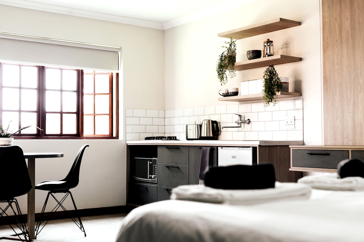 Compliant to Covid-19 cleaning and hosting regulations. Newly renovated open plan room, separate from the main house - offering a queen size bed, luxurious bath, shower and separate toilet. This room has it's own designated outside area. Close to: Kloof Hospital, Wolwespruit mountain biking & trail run park, Faerie Glen Hospital, Menlyn Maine, Menlyn Mall, Sun Time Square Arena/Casino, N1 , Lynnwood Bridge, The Club Centre, The Village - Hazelwood