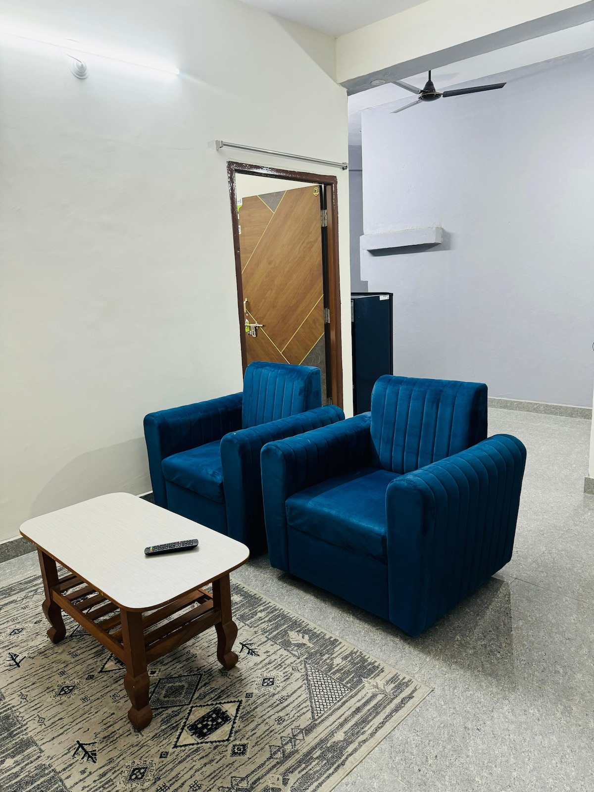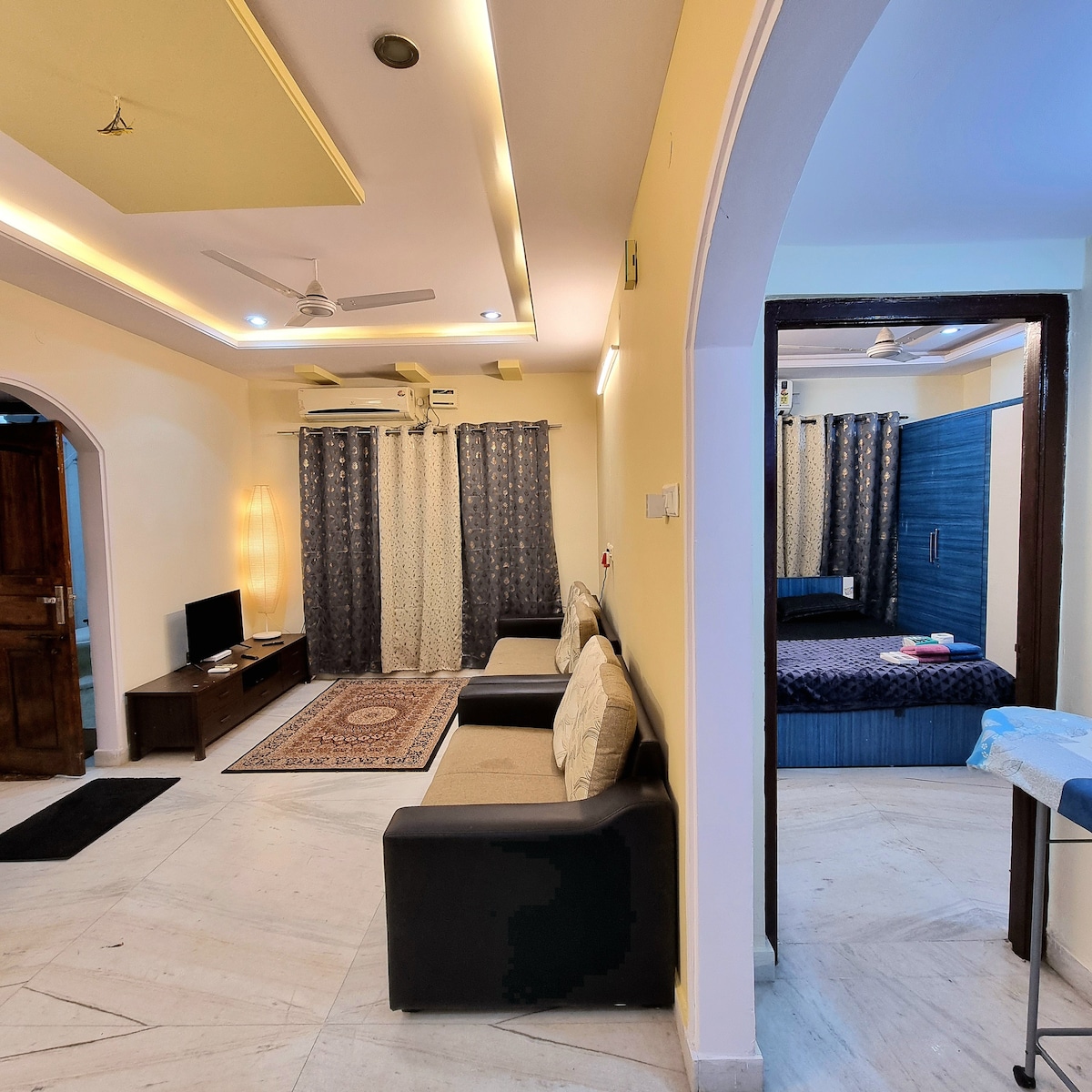 Welcome to your ideal home away from home. Our apartment is on the first floor of the villa without a lift, exclusively for the families only. Unmarried couples and Bachelors are restricted. Our apartment is spacious. A/C in both the bedrooms, with attached bathrooms. Featuring two spacious bedrooms, our retreat ensures a peaceful night's sleep . The master bedroom is with a king-size bed, while the second bedroom is with a queen-size bed, and two additional floor mattresses.