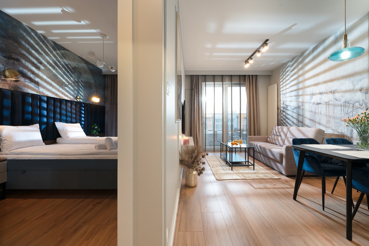 Apartament z prywatną sauną fińską, balkonem. Jasny, pięknie wykończony! Posiada wydzieloną sypialnię z dużym wygodnym łóżkiem, szafą i TV. W salonie- komfortowa rozkładana duża sofa, stół. Aneks kuchenny wyposażony jest w m.in.: zmywarkę, kuchenkę mikrofalową, indukcyjną płytę grzewczą, zlew, czajnik elektryczny, ciśnieniowy ekspres do kawy z młynkiem, opiekacz/toster, naczynia i sztućce. W łazience: prysznic, pralka. W korytarzu: duża szafa na ubrania oraz mniejsza- na okrycia wierzchnie.