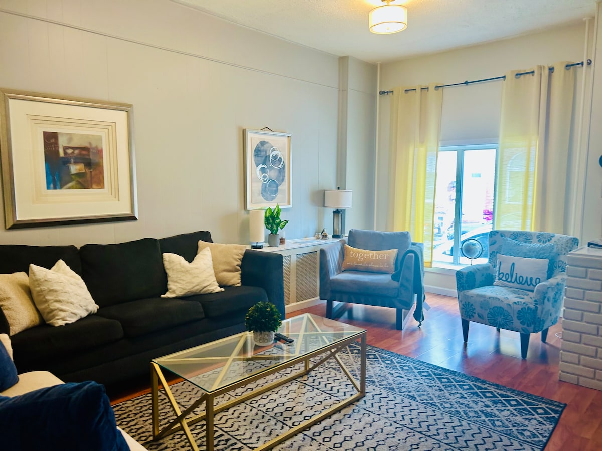 Kick back and relax in this calm, stylish space! No details were spared in the latest renovation to Maura & Pete's Airbnb properties. From the moment you walk in you will be overwhelmed with the tremendous comfort in the living room leading to a kitchen well equipped with your cooking needs. Along the way there is a washer & dryer if needed. Upstairs you will find a gorgeous bathroom right next to a perfectly laid out bedroom w/ plush king bed where you can watch your favorite show on the HD TV!