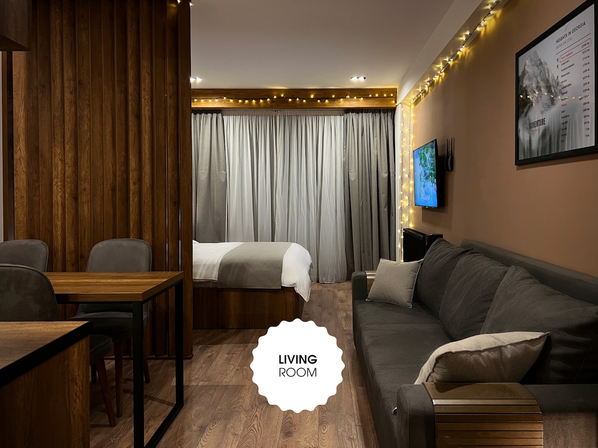 Welcome to the studio in Gudauri, Georgia, at an altitude of 2200 metres! Fresh renovation with wood and stone creates a cosy mountain atmosphere. Perfect lighting, functional areas - living room, bedroom, kitchen with panoramic windows giving natural light. The sunny side offers stunning mountain views. Close to the ski lift, shops and restaurants - ideal for a ski holiday. This studio combines style, comfort and functionality for an unforgettable holiday.