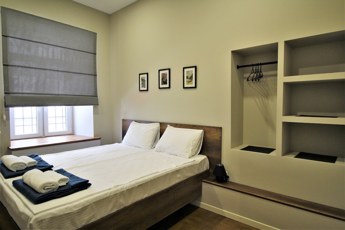 Bright room with two queen beds, ideal for small families or groups of four. Includes a private bathroom with a walk-in shower, free Wi-Fi, TV, safe, mini fridge, and an electric kettle with coffee and tea. Fresh towels, bed sheets, and toiletries provided. Shared kitchenette and co-working space available. This room faces the rear side of the building. Located in central Vake. Contactless check-in/out