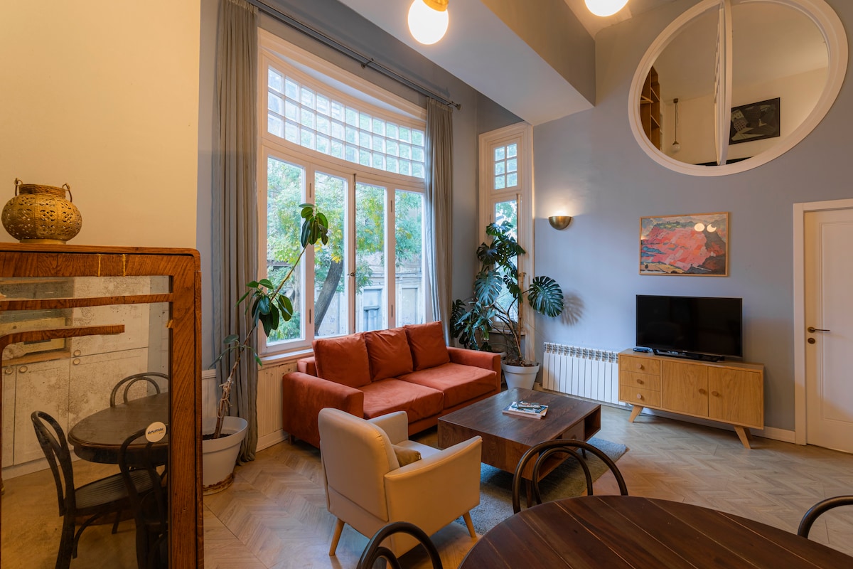 Welcome to our beautiful loft located in the heart of old Tbilisi's cultural heritage district, Sololaki. Our recently renovated loft boasts a vintage Georgian style, complete with authentic bricks, wood ceilings, and restored doors. With a panoramic view from the huge balcony, you can enjoy the breathtaking scenery that surrounds you.