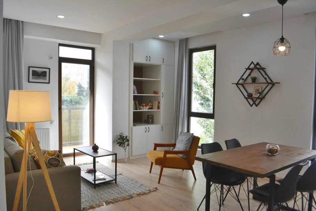 Newly renovated modern and comfortable apartment located in 'Nadzaladevi' district (Tornike Eristavi Street), near the 'Didube metro station and Kikvidze' park ('Veterans Square '). equipped with all necessary amenities: central heating, free WIFI and TV, kitchen, fridge, microwave, stove, shower, toilet, hygiene items, hair dryer, towels, bedding. A separate bedroom with a double-sized bed to ensure good rest and sleep. wardrobe and scales. Hope you will have a good time in Tbilisi
