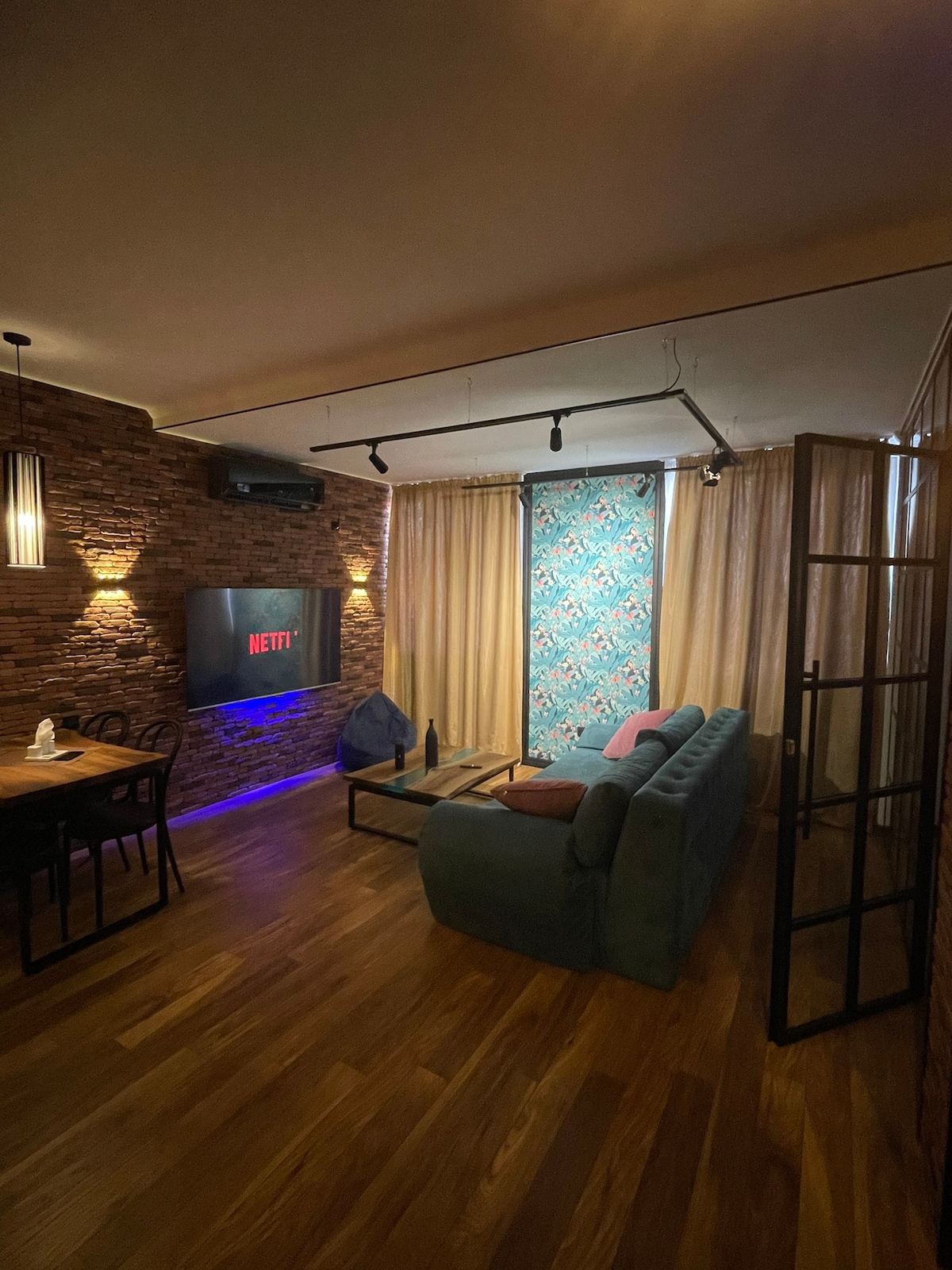 INDUSTRIAL Studio in old soviet building designed by "VIRSTAK", brings unique atmosphere with spectacular day and night CITY VIEW enjoyable from the BATHTUB. -100% HANDMADE. - Not a RANDOM cozy/ functional apartment, Studios amenities consists of old vintage and industrial furniture, for some people might feel uncomfortable out coming from a personal taste. Artistic vibe making you feel like in movies. - WINERY - 9 SORTS of wine - Movie Projector Airport pickup Suzuki Swift 80 Gel
