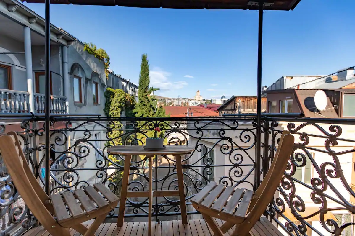 This property is in a one of the first historical buildings in the heart of old Tbilisi. It uniquely combines the charm of centuries-old neighbourhood with the stylish look and amenities of a modern and comfortable home. Beautifully decorated, colourful, stylish interior, with windows on all sides offering great views of the whole city and a cozy balcony with table & chairs for you to enjoy exploring the city even from home. Perfect place to stay for families, couples, small groups of friends.