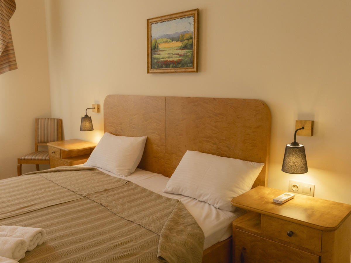 A spacious room in a young and developing Moosica Hostel in the very centre of Tbilisi. The hostel is located right between State Conservatoire and Tbilisi Opera and Ballet Theatre and has music as its main theme. This room has a king-size double bed, a table with 2 chairs, a clothes rack and a fan. Hostel guests can use a shared kitchen and bathrooms and spend time in a lobby with piano and bar.