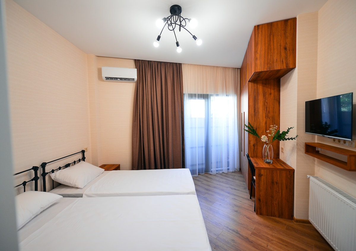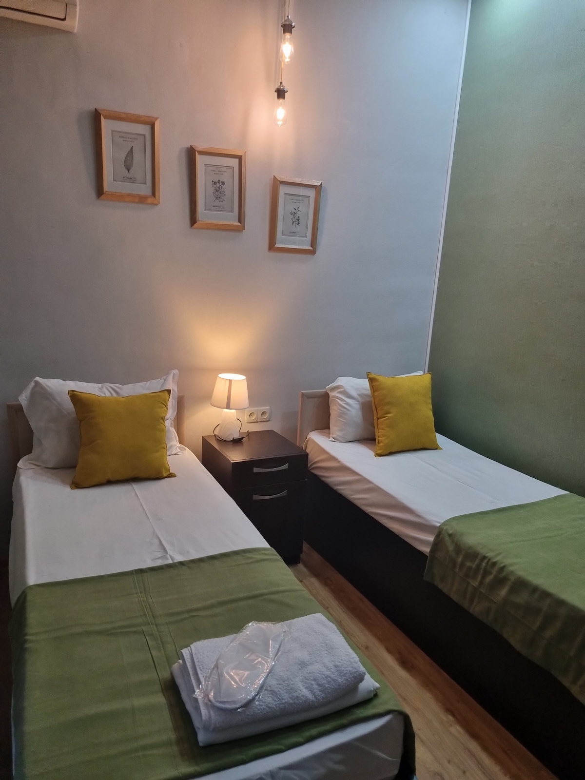 Bright room with two queen beds, ideal for small families or groups of four. Includes a private bathroom with a walk-in shower, free Wi-Fi, TV, safe, mini fridge, and an electric kettle with coffee and tea. Fresh towels, bed sheets, and toiletries provided. Shared kitchenette and co-working space available. This room faces the rear side of the building. Located in central Vake. Contactless check-in/out