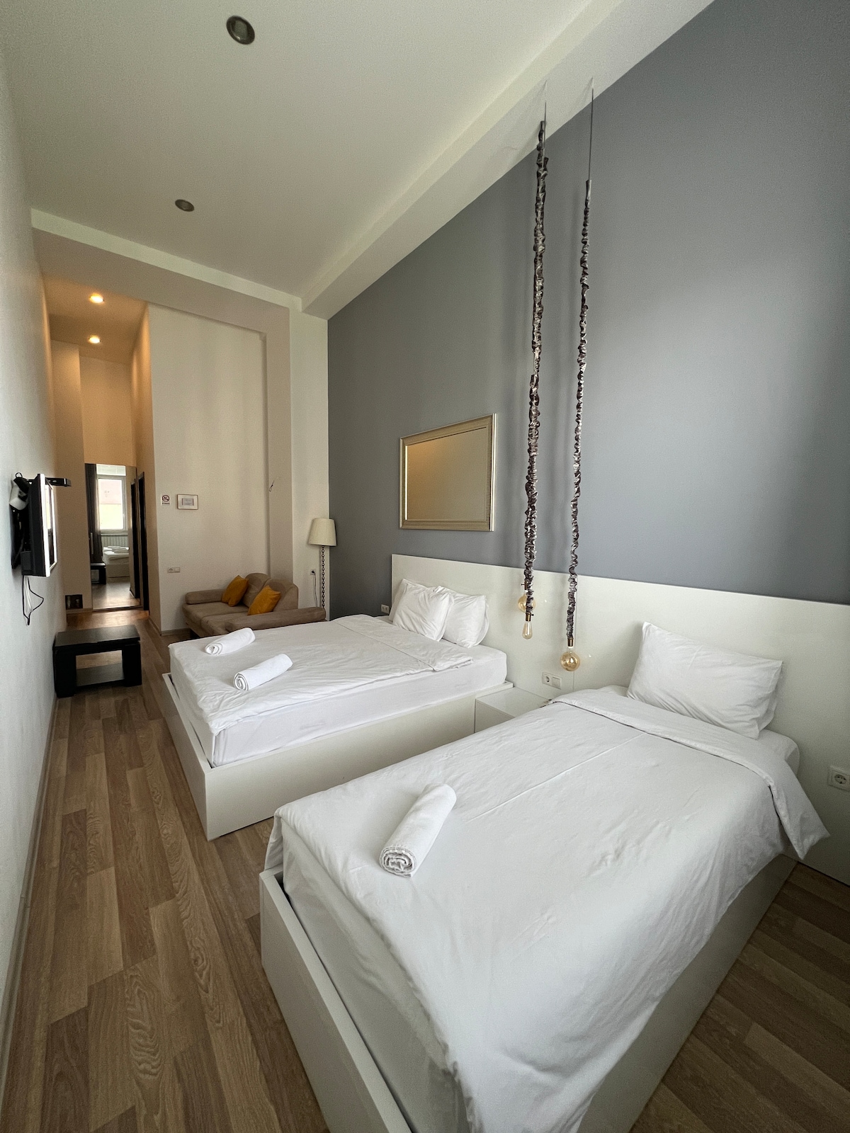 Welcome to Aparthotel Mtatsminda, located in the heart of Tbilisi near Rustaveli Avenue. Set in a historic building, our three newly renovated rooms offer quality mattresses, fresh linens, and kitchenettes for a comfortable stay. Located on the second floor, two rooms share a large balcony. All rooms face Mtatsminda Mountain with beautiful views of St. David’s Church and the Tbilisi TV Tower.