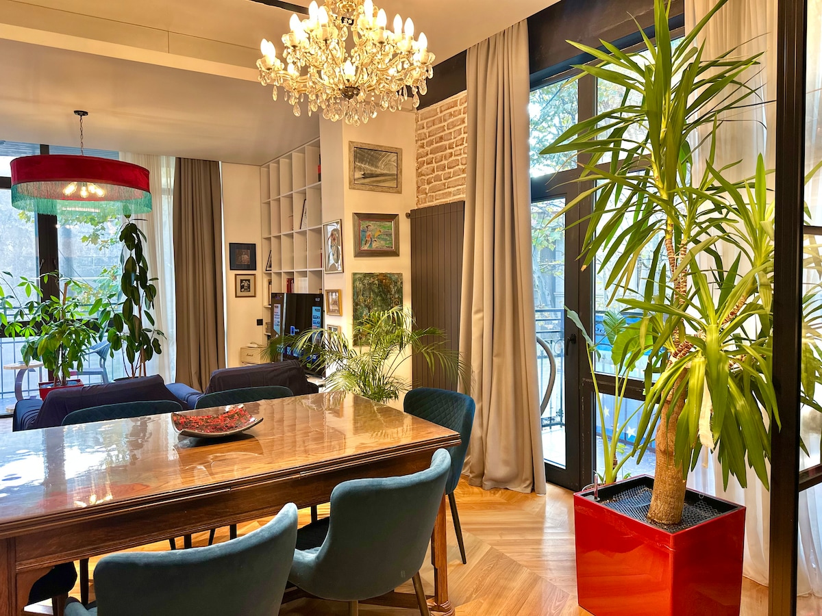 Book your stay at our charming designer loft and experience luxury living by the river! This pristine, cozy space in mint condition is fully equipped with modern amenities for a comfortable stay. Relax on a sofa, work at the desk with high-speed mesh WiFi, or enjoy the charming balcony with views of the Mtkvari river and lively Mtatsminda lights. Located on a quiet street near Marjanishvili Square, enjoy a peaceful retreat while being moments away from the city's top attractions.
