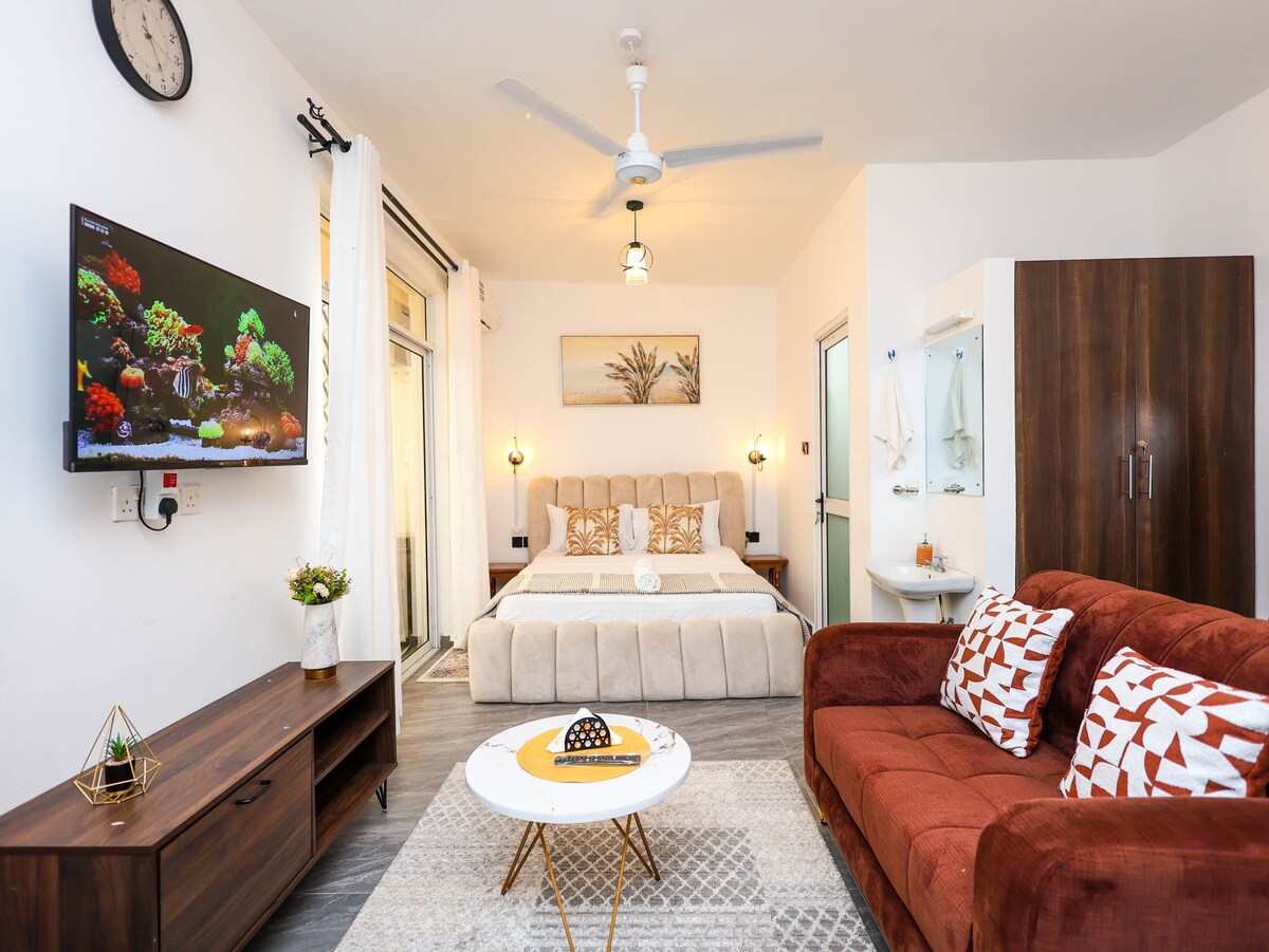 Experience the perfect blend of modern luxury and tranquility in our exquisitely furnished Studio apartment, nestled in the heart of Mtwapa behind Mtwapa Mall in a recently completed apartment block. This serene oasis offers an unmatched level of comfort and convenience. Our Studio comes complete with a kitchenette, a charming open-aired balcony, Wifi, spacious shower and smart TV. It embodies a unique homely ambiance, ensuring that your stay with us will be nothing short of unforgettable.