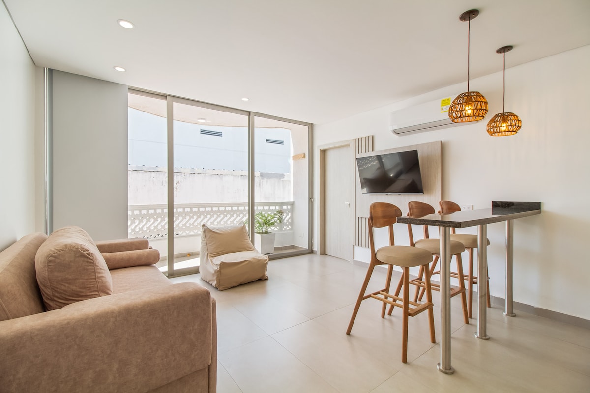 Experience Cartagena from a modern, bright, and minimalist apartment 🌿. Relax on a spacious balcony with stunning views of the Caribbean Sea and unforgettable sunsets 🌅. Located in a quiet and safe neighborhood, just 5 min walk from the airport ✈️, steps from Crespo Beach 🏖️, and 10 min by car from the historic Old Town. Enjoy exclusive amenities: semi-Olympic pool and kids pool 🏊, sauna and steam room ✨. Comfort, prime location, and Caribbean charm… all in one place! ☀️🌴