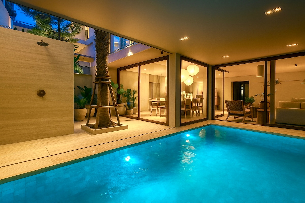 The design of the villa is inspired by Wabi-sabi style. Wabi-sabi home is one that embraces authenticity, finds value in the lovingly weathered and lived-in, and promotes an overall sense of peace and tranquility using simplicity. Light wooden teaks were used throughout the design to set a natural and relaxing atmosphere. - The pool is 8x3 m. which is very big for a couple. - Quility bedding, King size bed - 65" smart TV. - working table - comfortable seating area (for TV) - sun bathing chairs