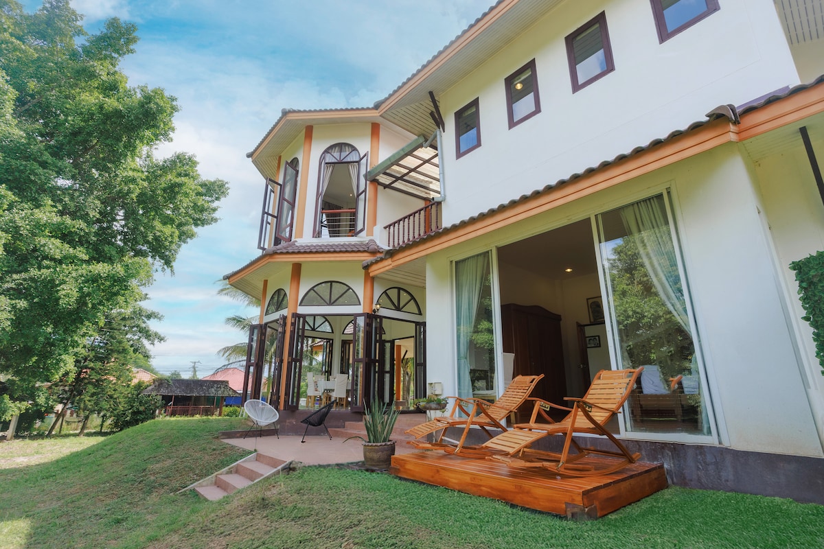 全新英式泳池别墅(4个套房卧室,5个卫生间) ⛳️3x6米按摩喷头瀑布景观盐水泳池,院子可以停下3辆车! 🛏️4卧大床独立卫生间套房(1.8米两个,1.5米两个),都带独立卫生间,主卧带圆形浴缸 卧室1️⃣ 位于一楼(适合老人,或者孩子),可以看到花园景观。有一个1.5米的大床,配备空调和空气净化器。有独立淋浴卫生间。 卧室2️⃣ 位于二楼左手边(最大的主卧),可以看到泳池景观。有一个1.8米的大床,配备空调,空气净化器,电视。有一张放松躺椅,和沙发区域。有一个圆形浴缸,独立淋浴区域。有梳妆台和衣帽间。 卧室3️⃣ 位于二楼右手边,可以看到泳池景观。有一个1.8米的大床,配备空调,空气净化器。有衣柜和梳妆台。有独立淋浴卫生间。 卧室4️⃣ 位于二楼右手边,可以看到花园景观。有一个1.5米的大床,配备空调和空气净化器。有衣柜和梳妆台,有独立淋浴卫生间。 🛋️西式明火厨房,带烤箱,微波炉,中控岛台,大餐桌,KTV,带火炉客厅。 🧹短租带每日清洁卫生阿姨,中文英文泰文线上管家 🚗可付费安排接送机,一日游包车。