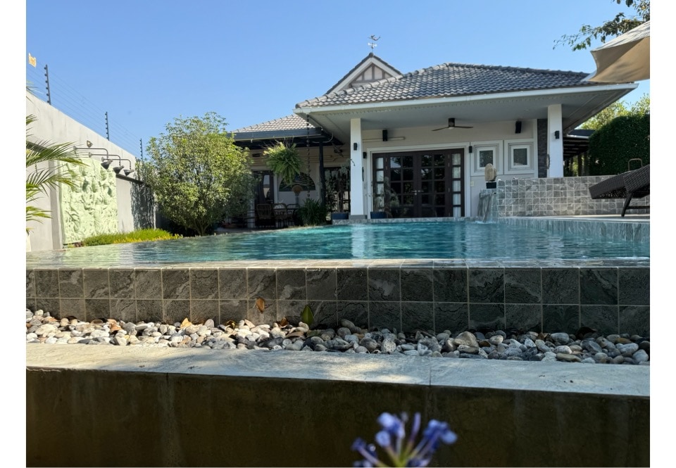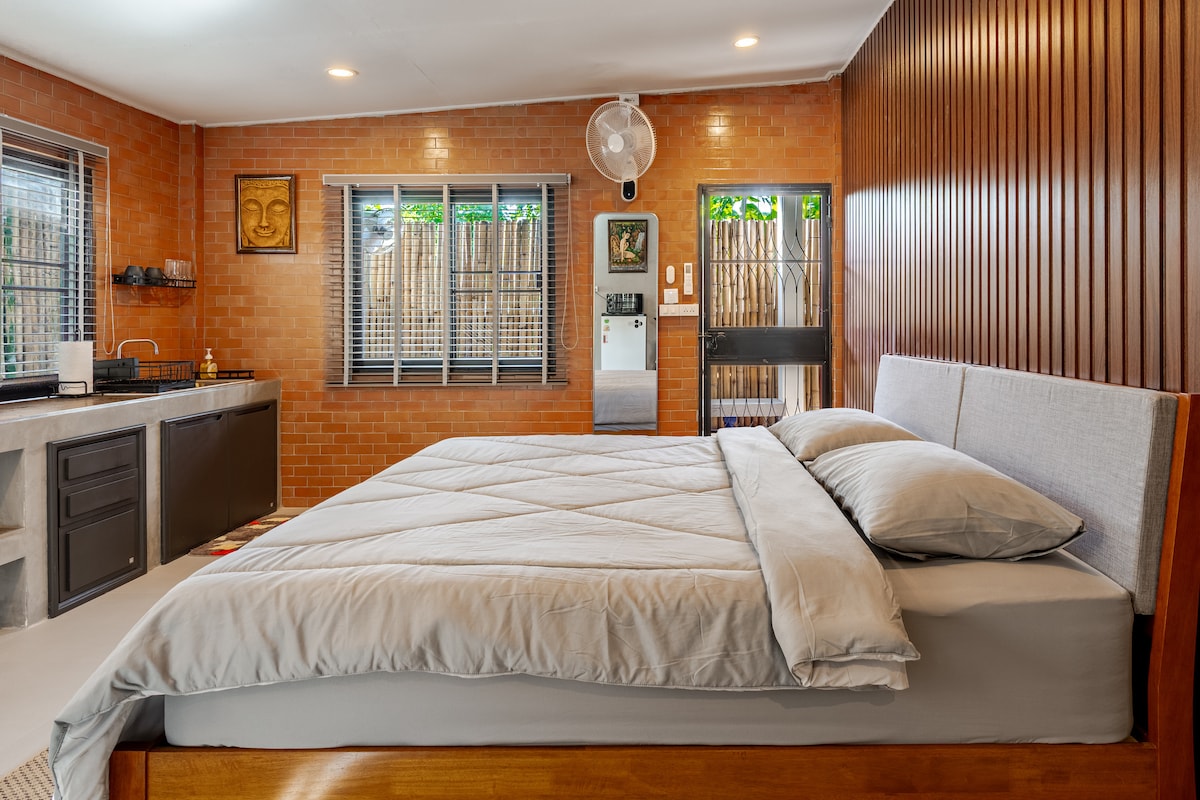 Relax at the guesthouse "Blue of Nature" near Chiang Mai City. In a peaceful village and built in 2023, this fresh, modern space is behind the main house, enveloped by greenery. It's brand new with bright windows, a cozy king bed, a small kitchen with essentials, and a clean bathroom. Enjoy amenities like TV, A/C, and fast internet. It's near the Royal Park Rajapruek. Enjoy made-in-order Thai meals from our chef with own organic garden herbs.