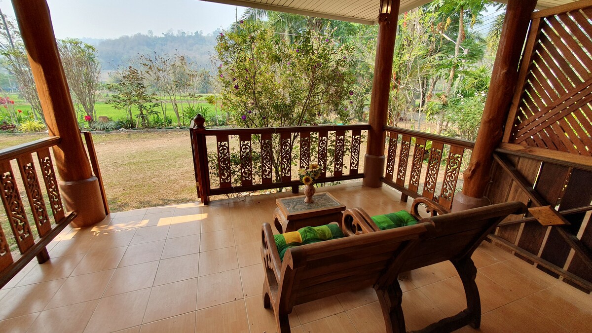 Relax with the whole family at this peaceful place to stay.a two-story-house for 5 people in the middle of go forest on our private mountain which is 10 mins from the white temple and singha park and only 5 km to the highest waterfall in Chiang Rai where you can trek and swim.the room has 60 sq.m. balcony and fire pit behind the house