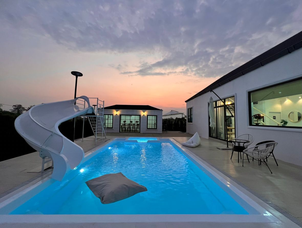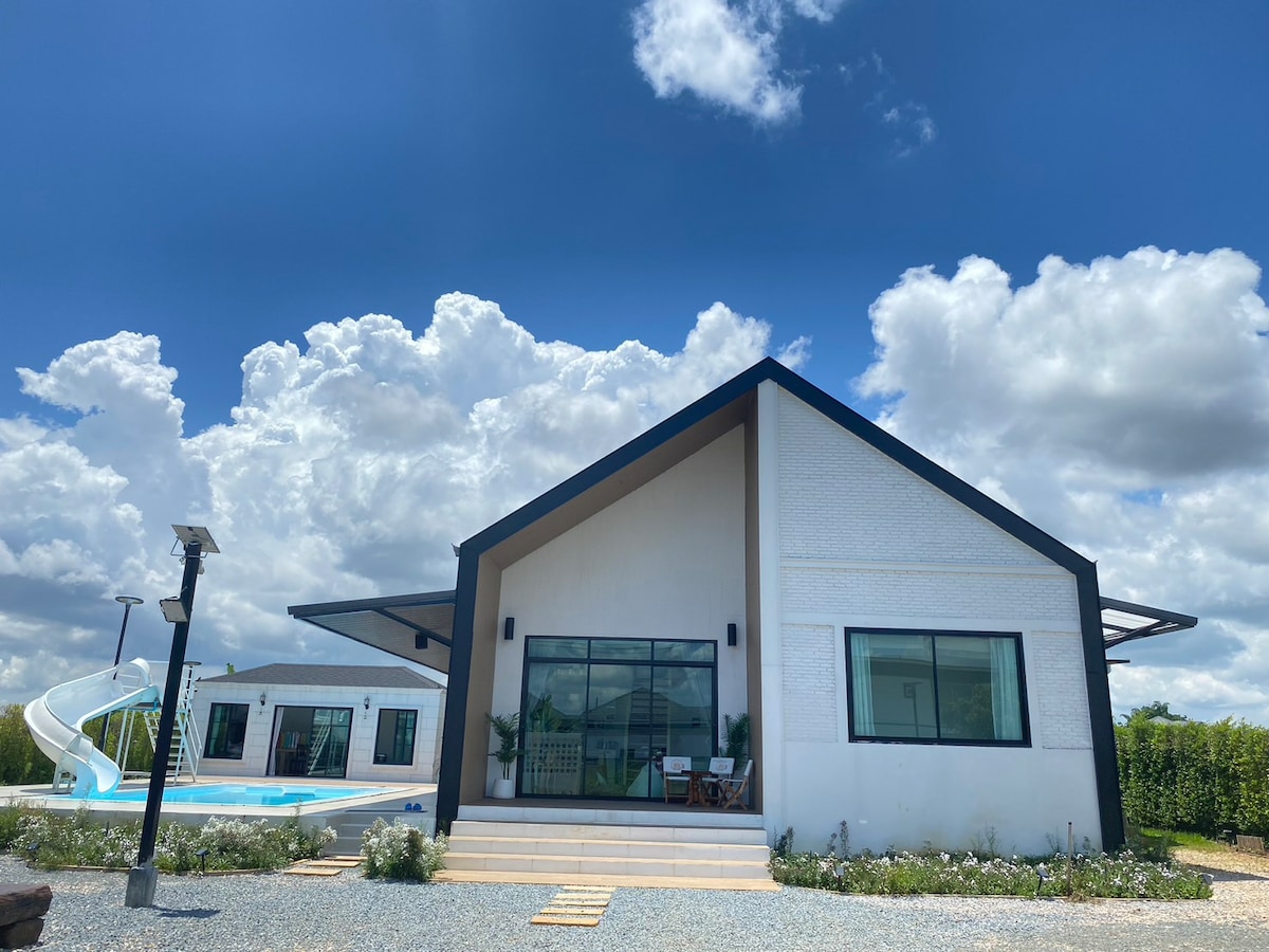 Relax in this peaceful modern pool villa surrounded by rice fields, just minutes from Singha Park and Chiang Rai city center. Enjoy a private pool, open bright spaces, and minimalist interiors designed for comfort. Perfect for couples, families, or friends looking for a calm retreat with easy access to cafes, nature, and local attractions.