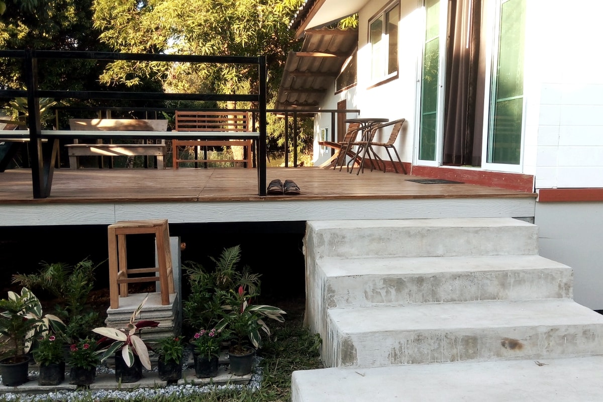Welcome to House #323 — a peaceful, compact garden escape with fast Wi-Fi and a private sauna. Perfect for a small family, a couple, or close friends, this cozy cottage offers one bedroom, two full bathrooms, a living room with a full kitchenette, a dining area, a long balcony, a front yard, and a relaxing backyard by the end-stream of Mae Korn. Smoking is allowed outside only.